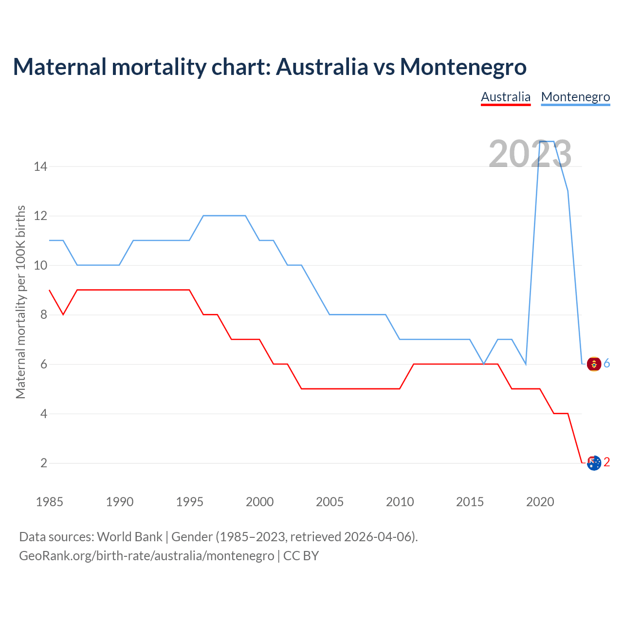 The maternal mortality rate, which is the probability of dying during childbirth or within 42 days of pregnancy termination, is 2 deaths per 100,000 live births in Australia, compared to 6 deaths in Montenegro.