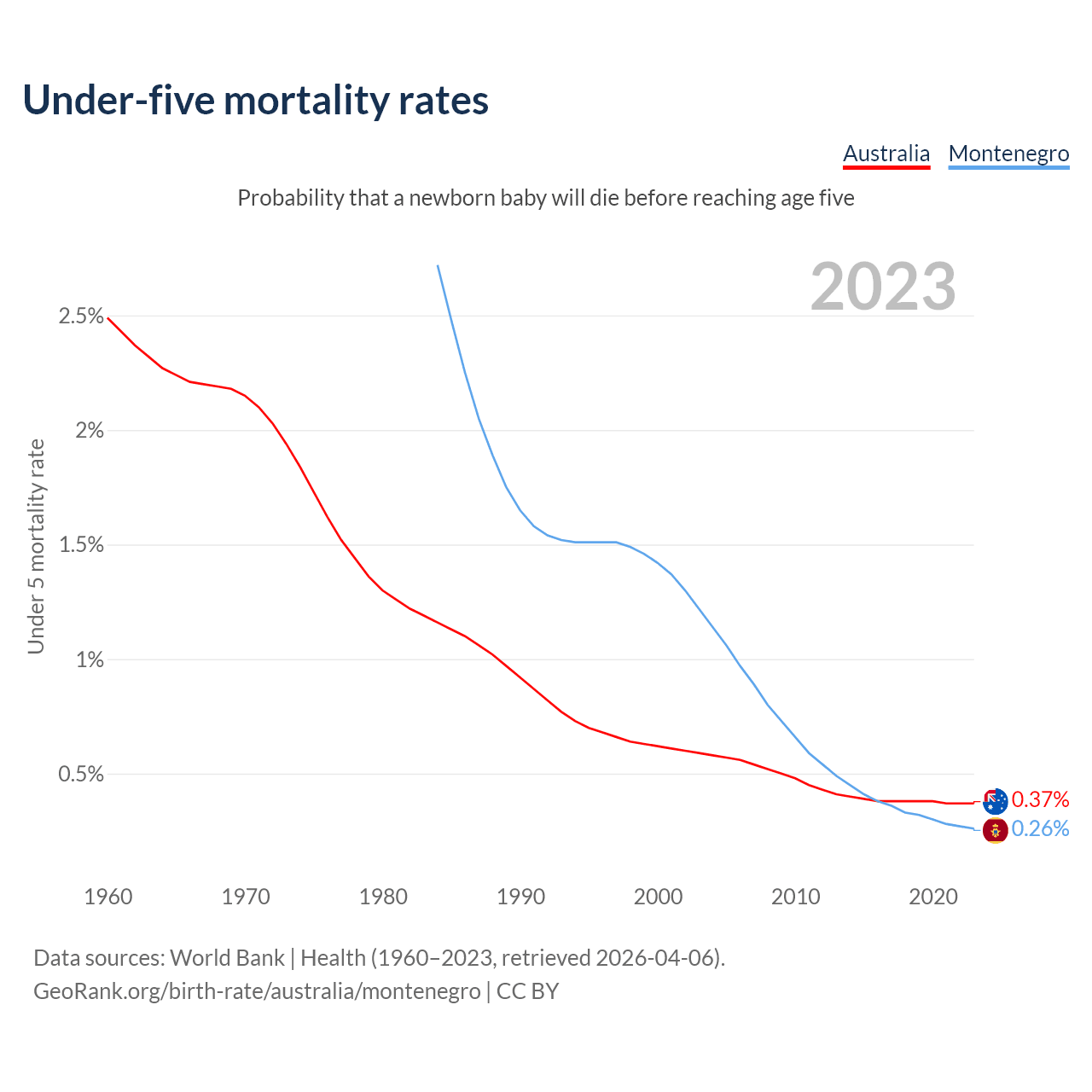 The chance that a newborn baby will die before reaching age five is 0.37% in Australia and 0.26% in Montenegro. Above is a chart with historical data on under-five mortality rates.