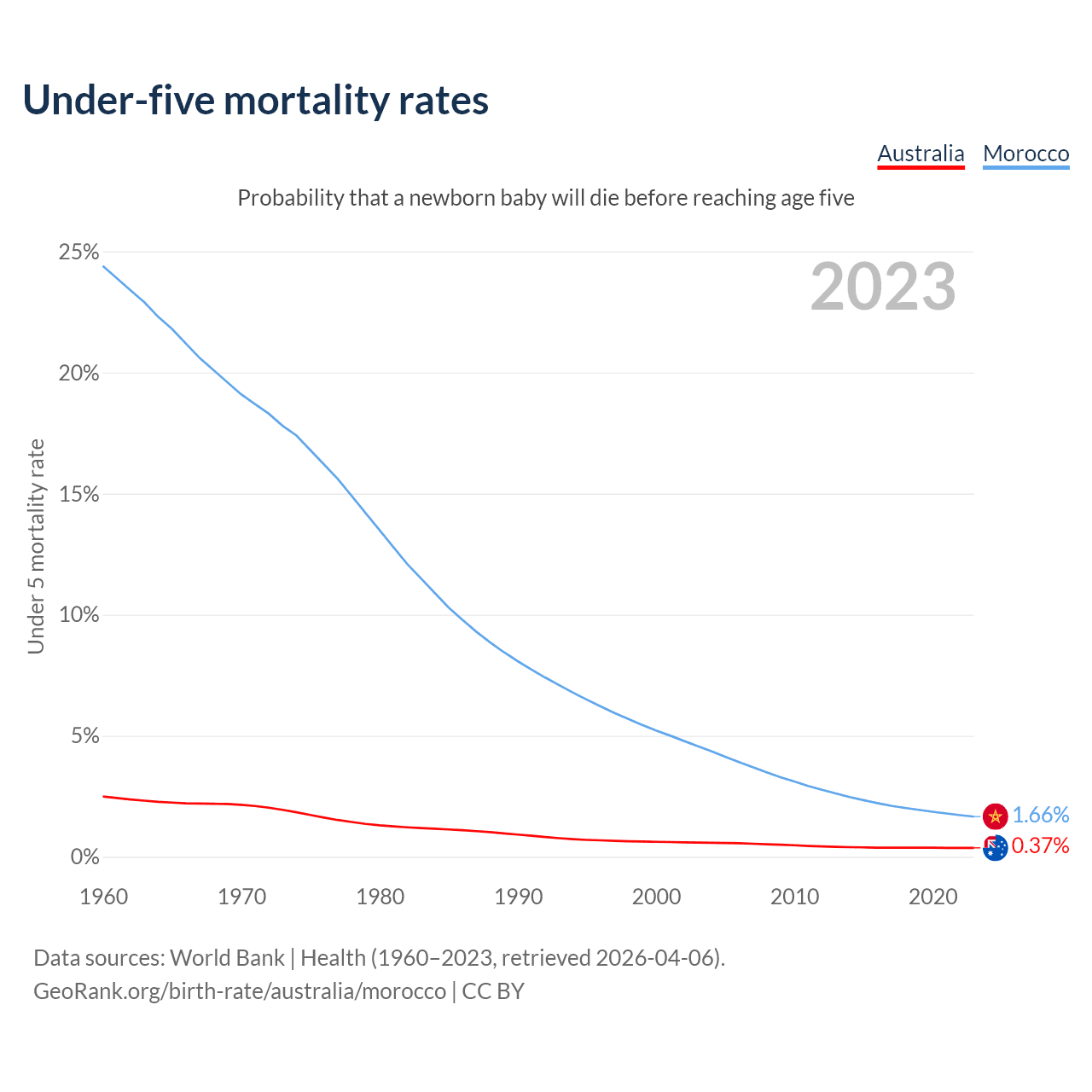 The chance that a newborn baby will die before reaching age five is 0.37% in Australia and 1.66% in Morocco. Above is a chart with historical data on under-five mortality rates.