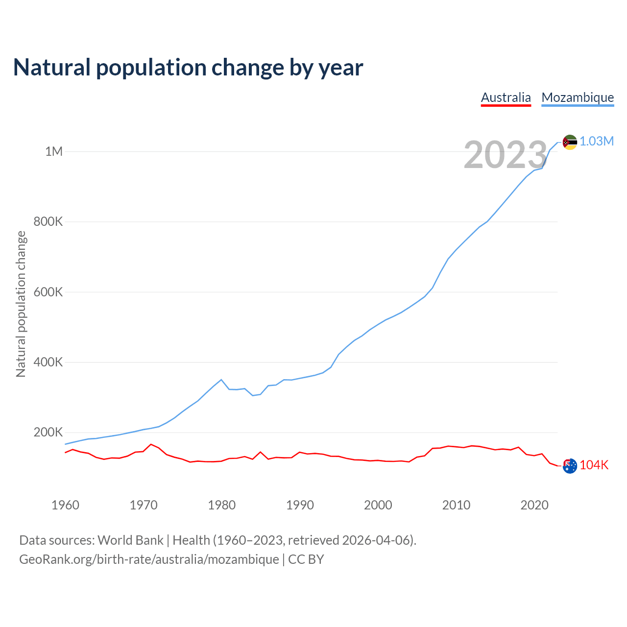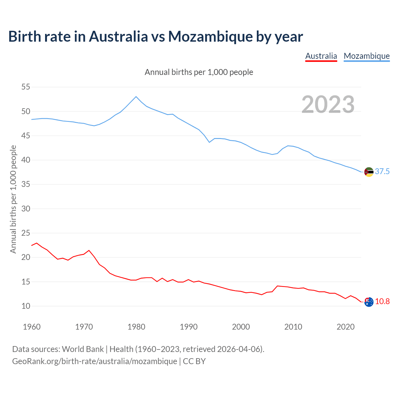 Australia has an annual birth rate of 10.8 births per 1,000 people, compared to 37.5 for Mozambique. The average number of children a woman is expected to have during her lifetime — the fertility rate, is 1.5 in Australia and 4.76 in Mozambique — 217.5% difference.
