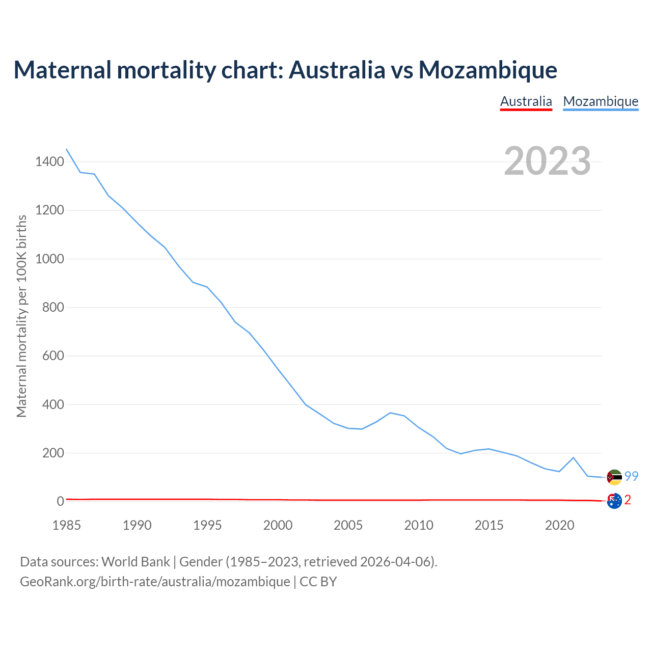 The maternal mortality rate, which is the probability of dying during childbirth or within 42 days of pregnancy termination, is 2 deaths per 100,000 live births in Australia, compared to 99 deaths in Mozambique.