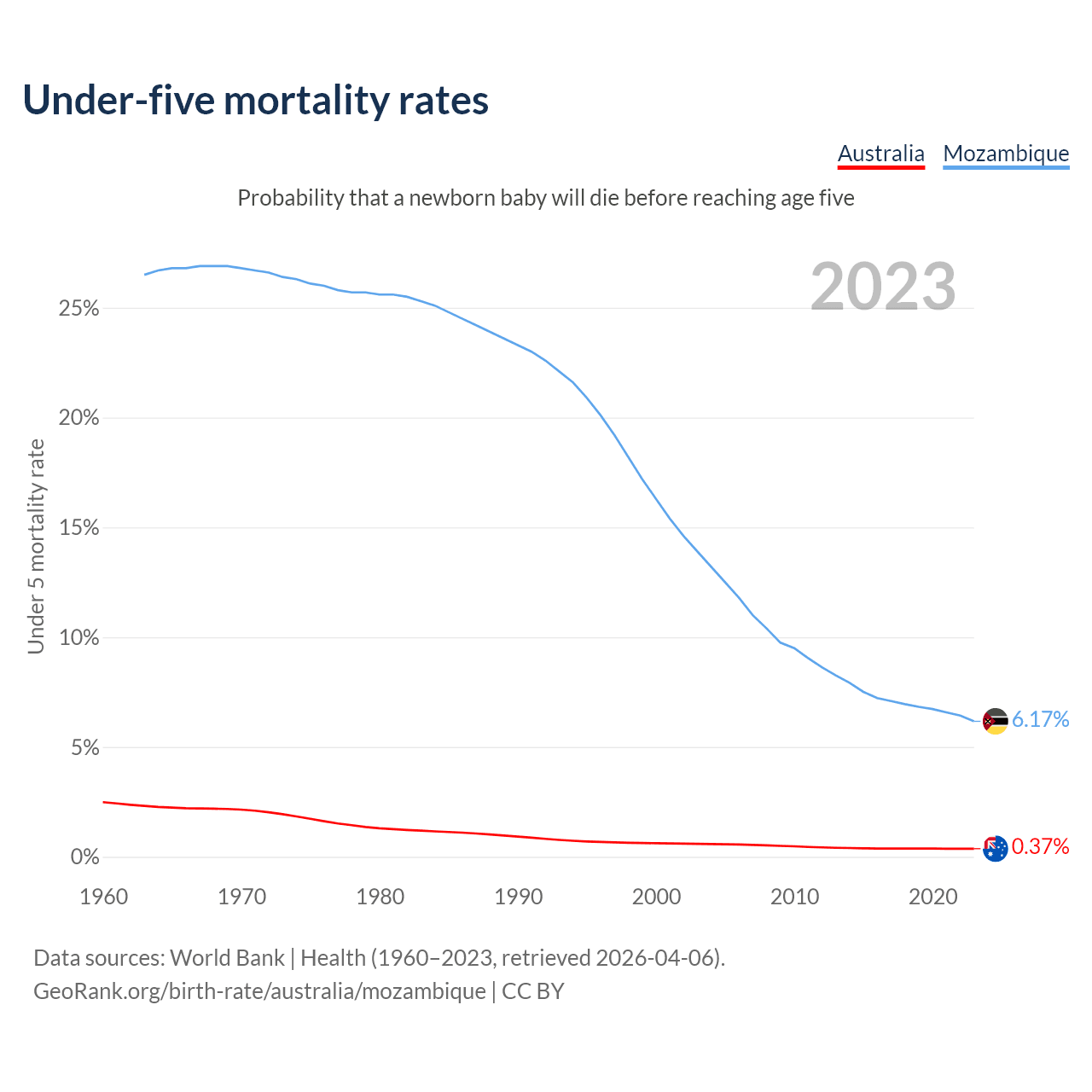 The chance that a newborn baby will die before reaching age five is 0.37% in Australia and 6.17% in Mozambique. Above is a chart with historical data on under-five mortality rates.