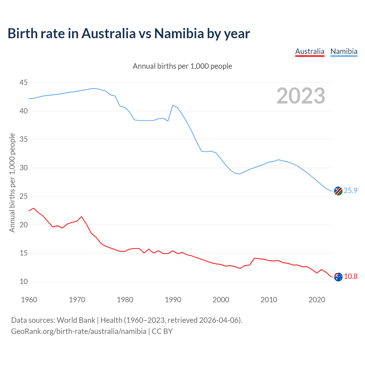 Australia has an annual birth rate of 10.8 births per 1,000 people, compared to 25.9 for Namibia. The average number of children a woman is expected to have during her lifetime — the fertility rate, is 1.5 in Australia and 3.21 in Namibia — 114.1% difference.