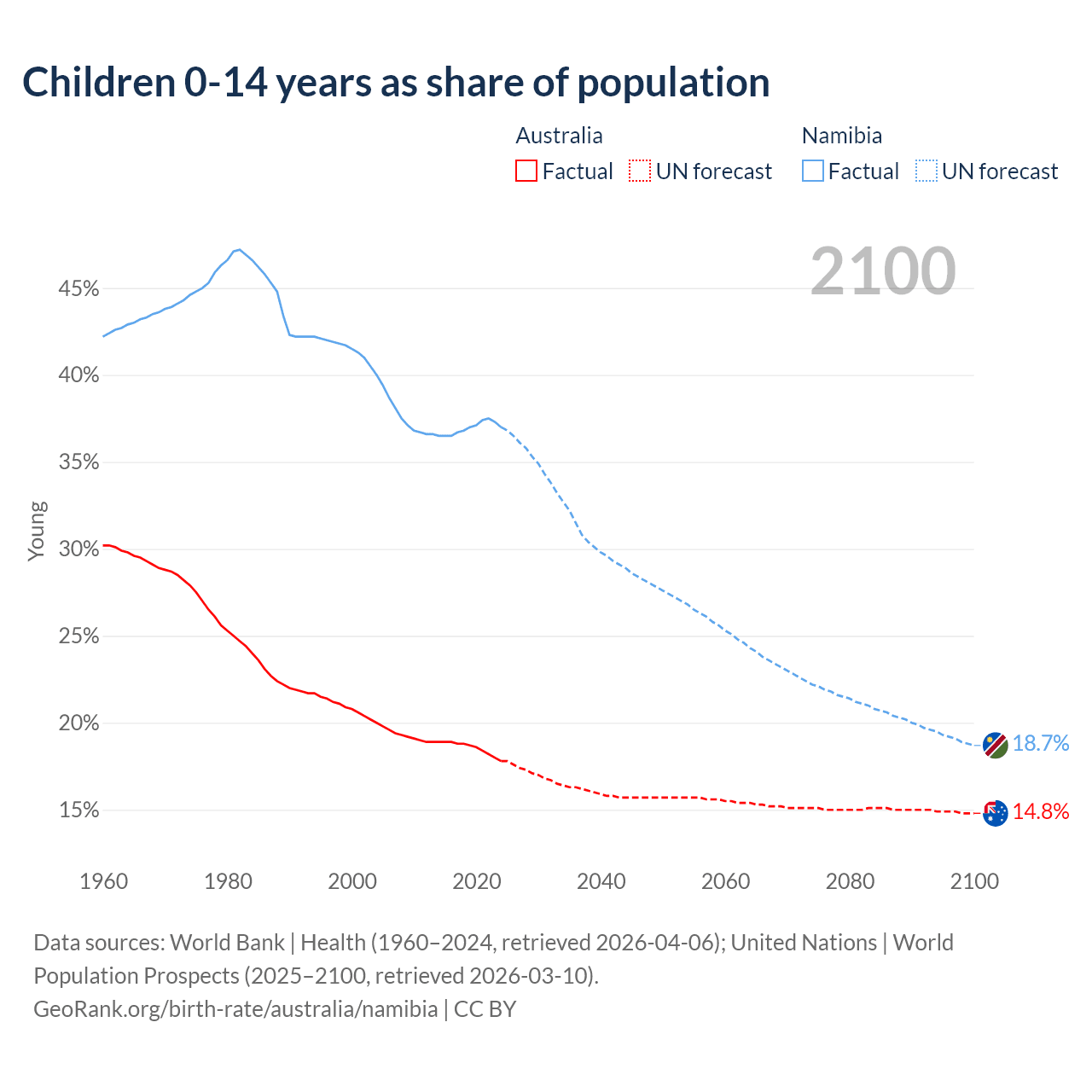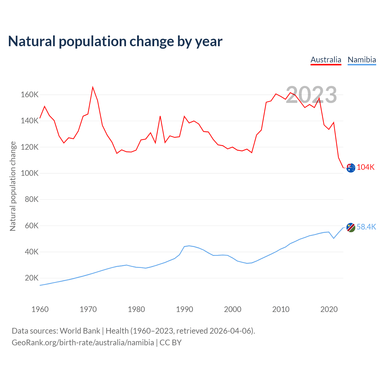 According to the latest available data on birth rates, the fertility rate in Australia was 1.5 children per woman in 2023, compared to 3.21 in Namibia in 2023. The replacement level is considered to be 2.1 children per woman.