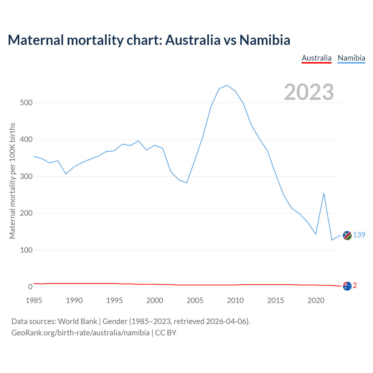 The maternal mortality rate, which is the probability of dying during childbirth or within 42 days of pregnancy termination, is 2 deaths per 100,000 live births in Australia, compared to 139 deaths in Namibia.