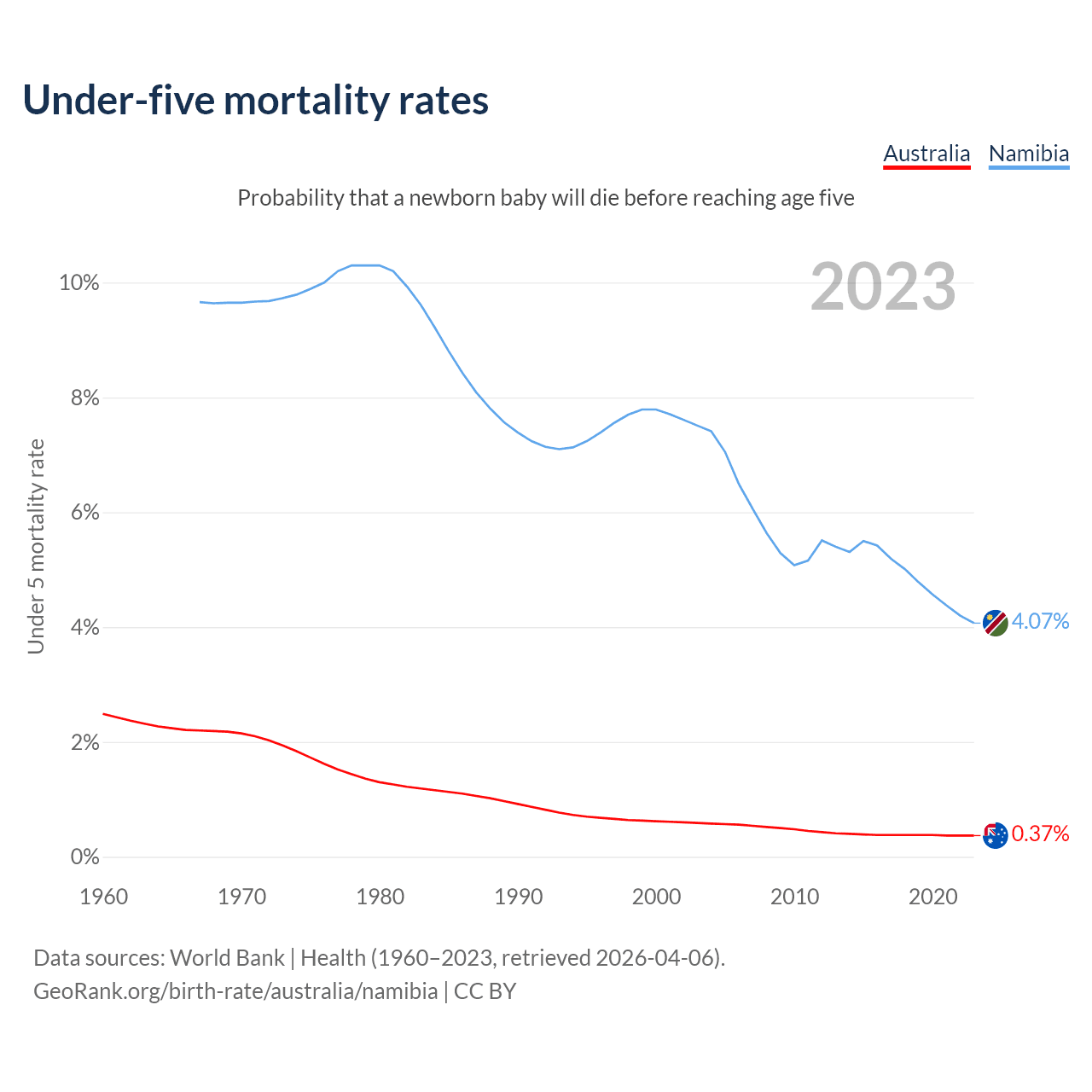 The chance that a newborn baby will die before reaching age five is 0.37% in Australia and 4.07% in Namibia. Above is a chart with historical data on under-five mortality rates.