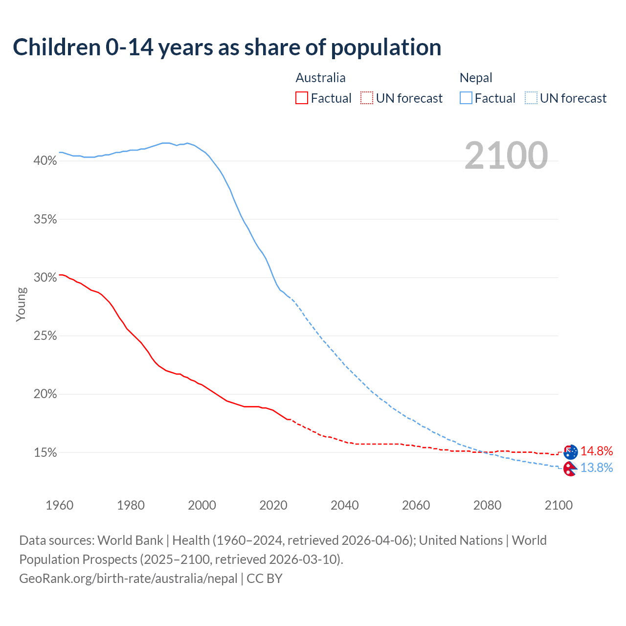 According to the latest available data on birth rates, the fertility rate in Australia was 1.5 children per woman in 2023, compared to 1.98 in Nepal in 2023. The replacement level is considered to be 2.1 children per woman.