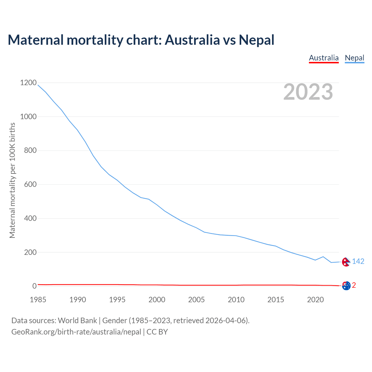 The maternal mortality rate, which is the probability of dying during childbirth or within 42 days of pregnancy termination, is 2 deaths per 100,000 live births in Australia, compared to 142 deaths in Nepal.