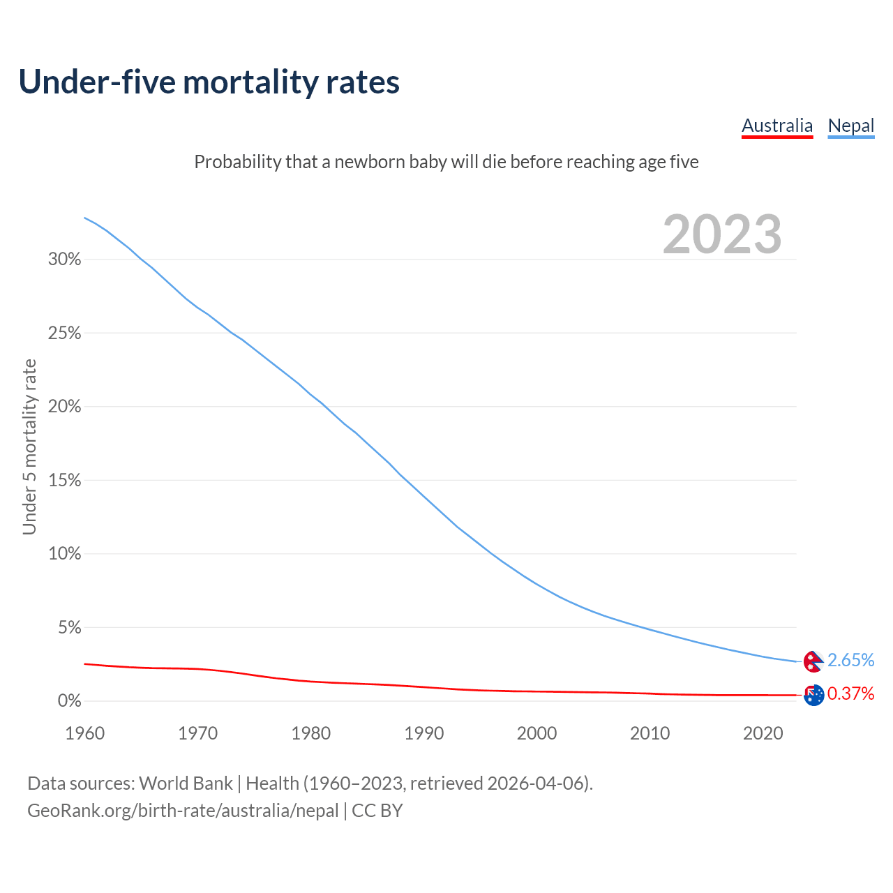The chance that a newborn baby will die before reaching age five is 0.37% in Australia and 2.65% in Nepal. Above is a chart with historical data on under-five mortality rates.