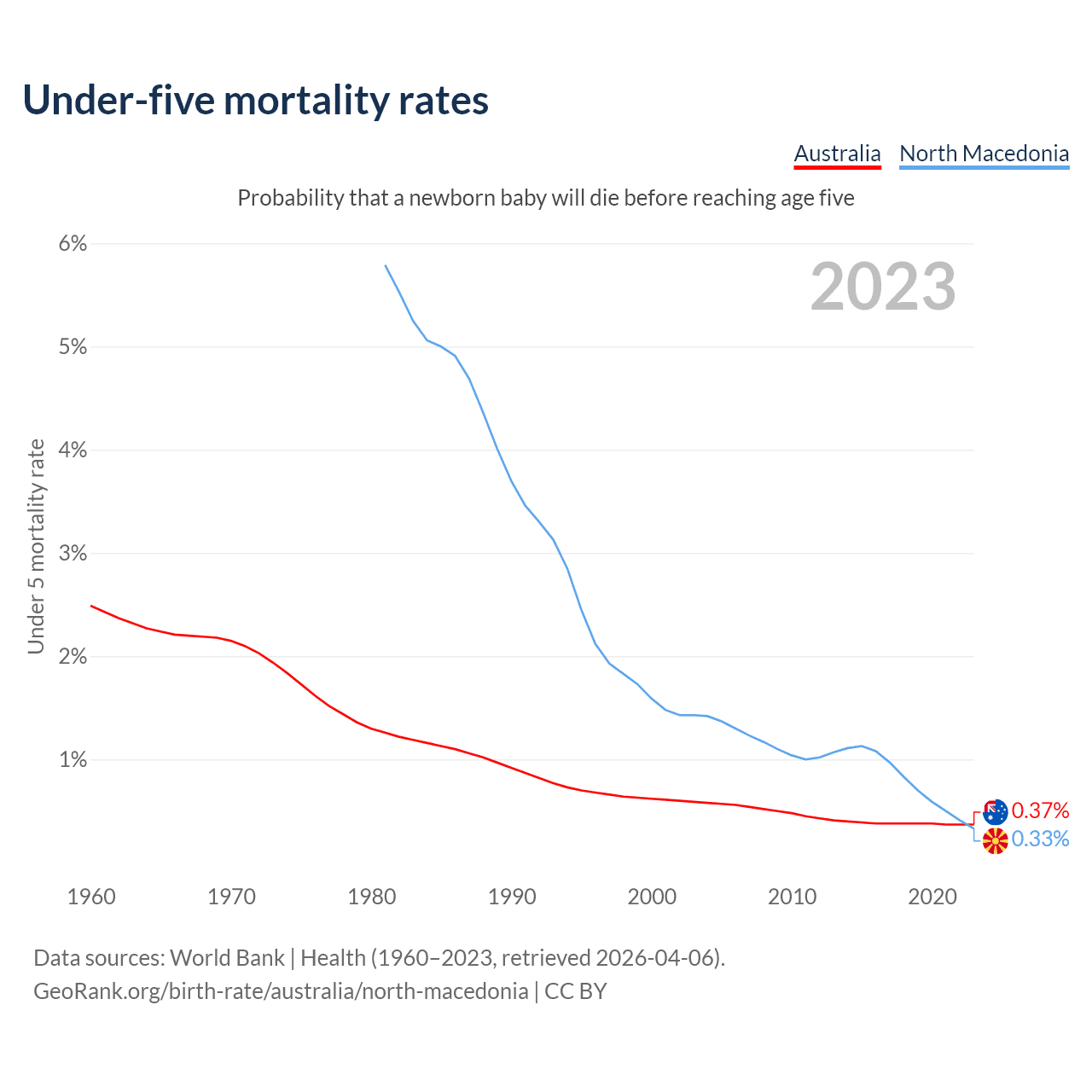 The chance that a newborn baby will die before reaching age five is 0.37% in Australia and 0.33% in North Macedonia. Above is a chart with historical data on under-five mortality rates.