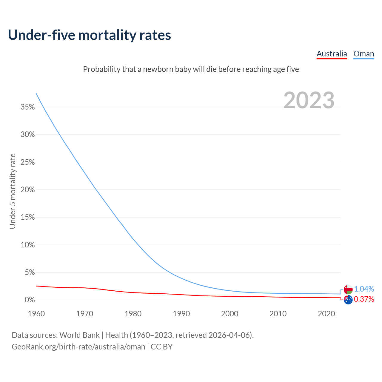 The chance that a newborn baby will die before reaching age five is 0.37% in Australia and 1.04% in Oman. Above is a chart with historical data on under-five mortality rates.
