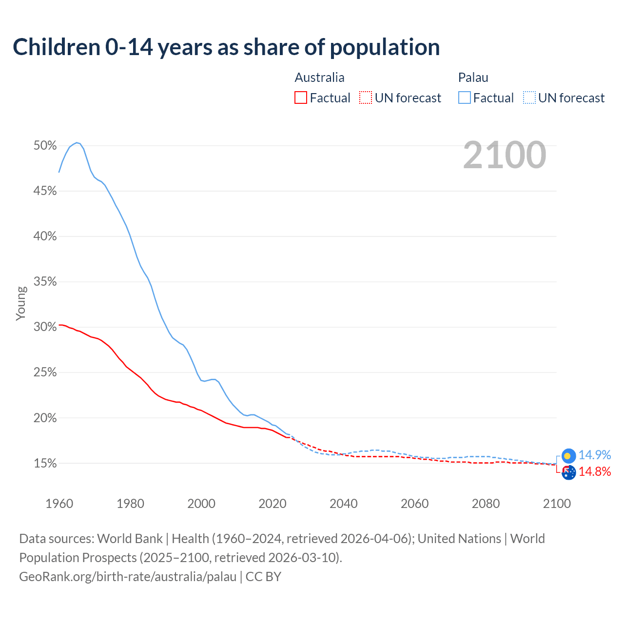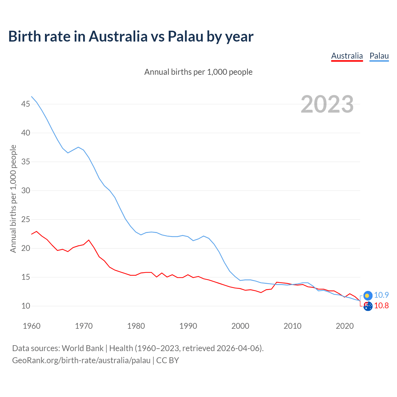 According to the latest available data on birth rates, the fertility rate in Australia was 1.5 children per woman in 2023, compared to 1.91 in Palau in 2023. The replacement level is considered to be 2.1 children per woman.