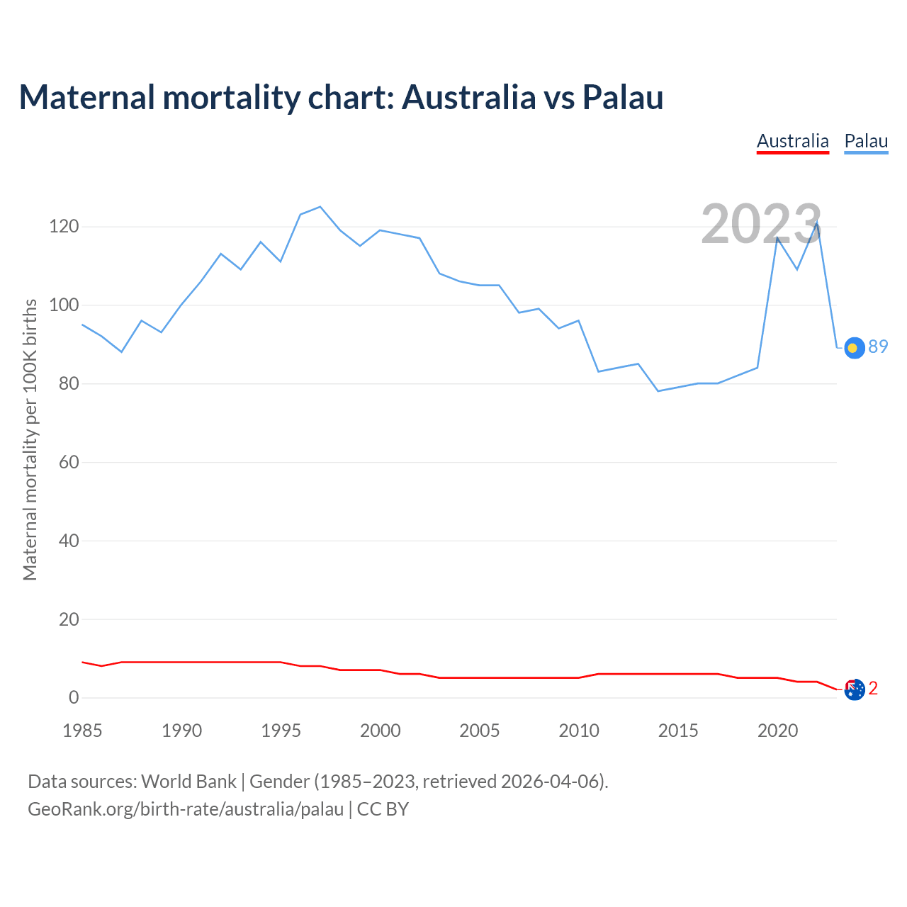 The maternal mortality rate, which is the probability of dying during childbirth or within 42 days of pregnancy termination, is 2 deaths per 100,000 live births in Australia, compared to 89 deaths in Palau.