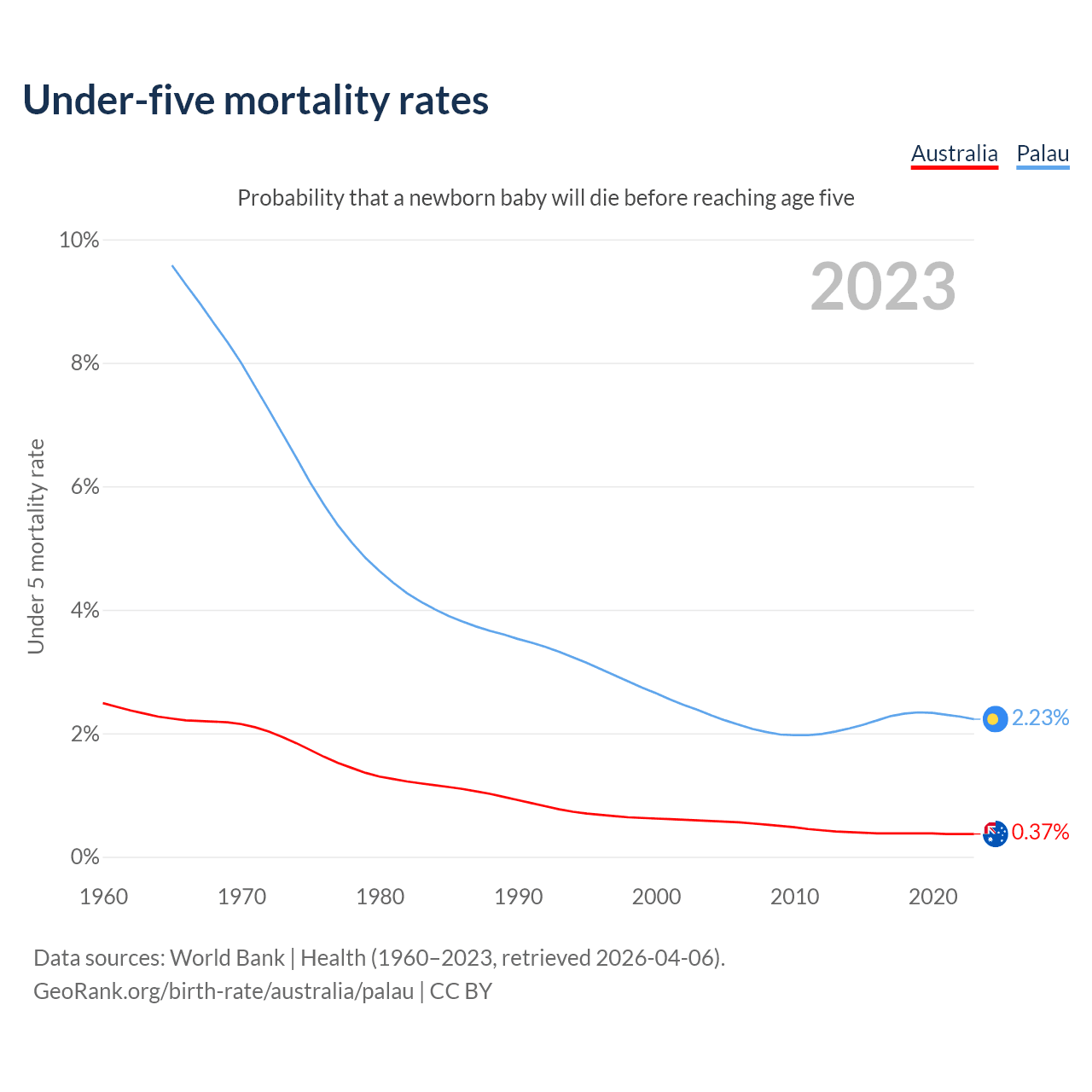 The chance that a newborn baby will die before reaching age five is 0.37% in Australia and 2.23% in Palau. Above is a chart with historical data on under-five mortality rates.