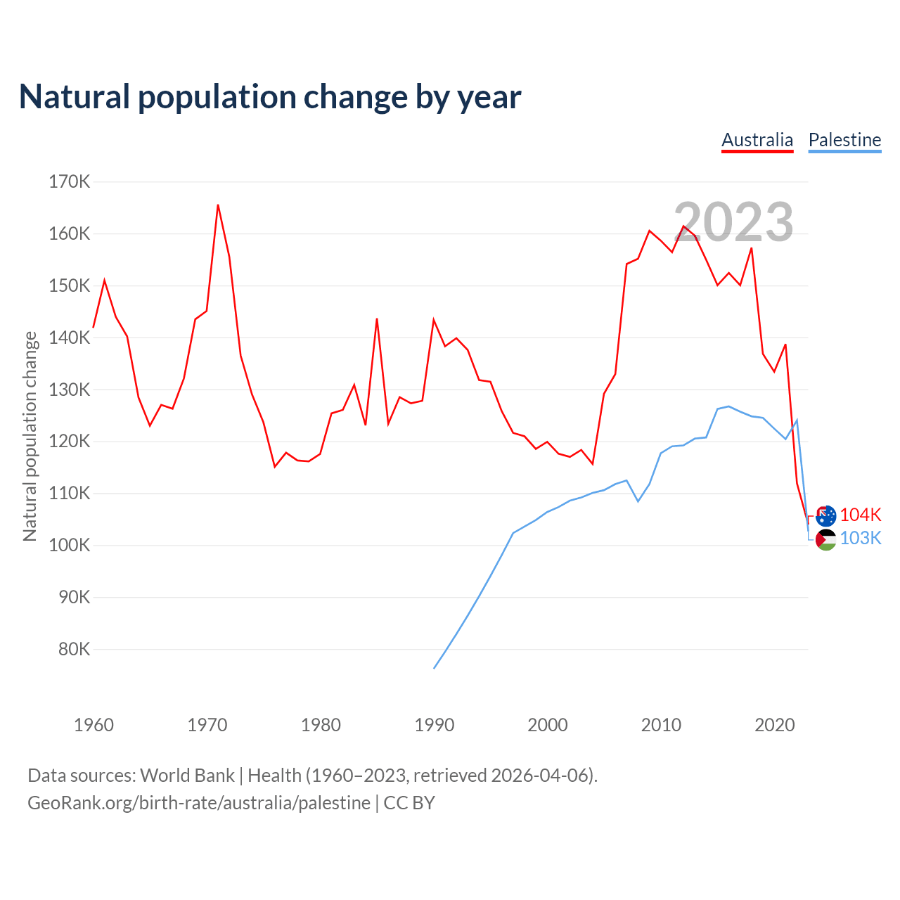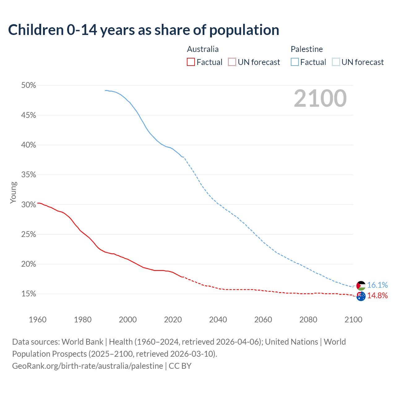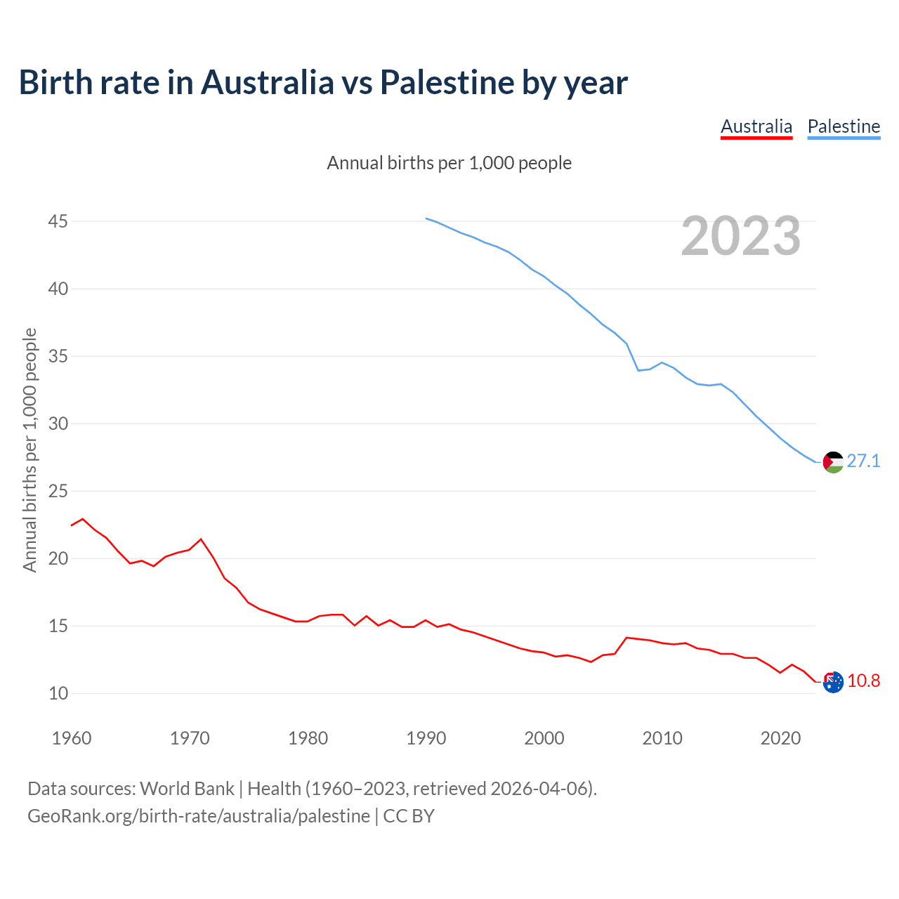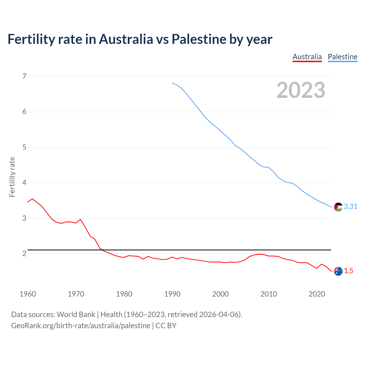 According to the latest available data on birth rates, the fertility rate in Australia was 1.5 children per woman in 2023, compared to 3.31 in Palestine in 2023. The replacement level is considered to be 2.1 children per woman.