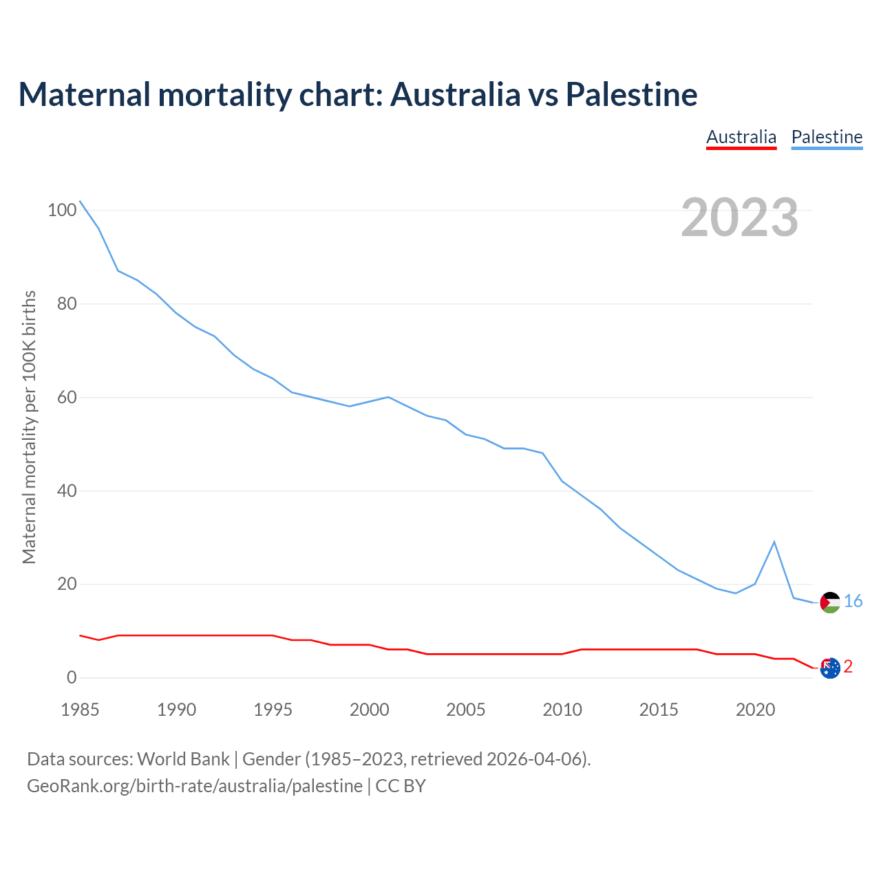 The maternal mortality rate, which is the probability of dying during childbirth or within 42 days of pregnancy termination, is 2 deaths per 100,000 live births in Australia, compared to 16 deaths in Palestine.