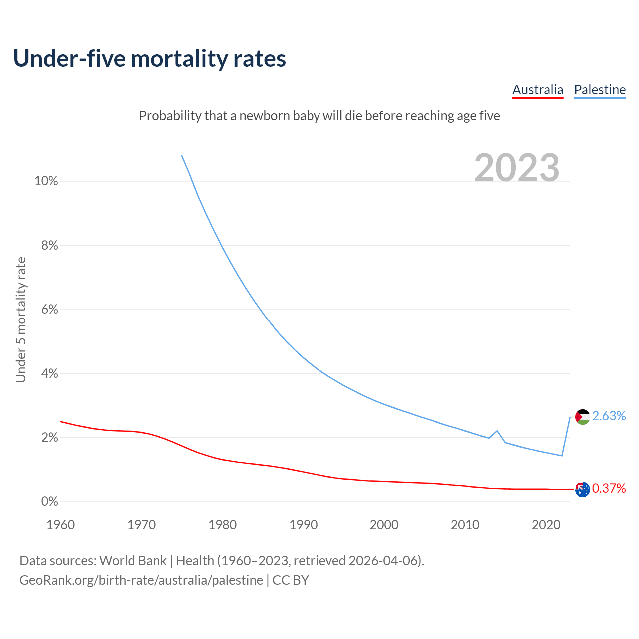 The chance that a newborn baby will die before reaching age five is 0.37% in Australia and 2.63% in Palestine. Above is a chart with historical data on under-five mortality rates.
