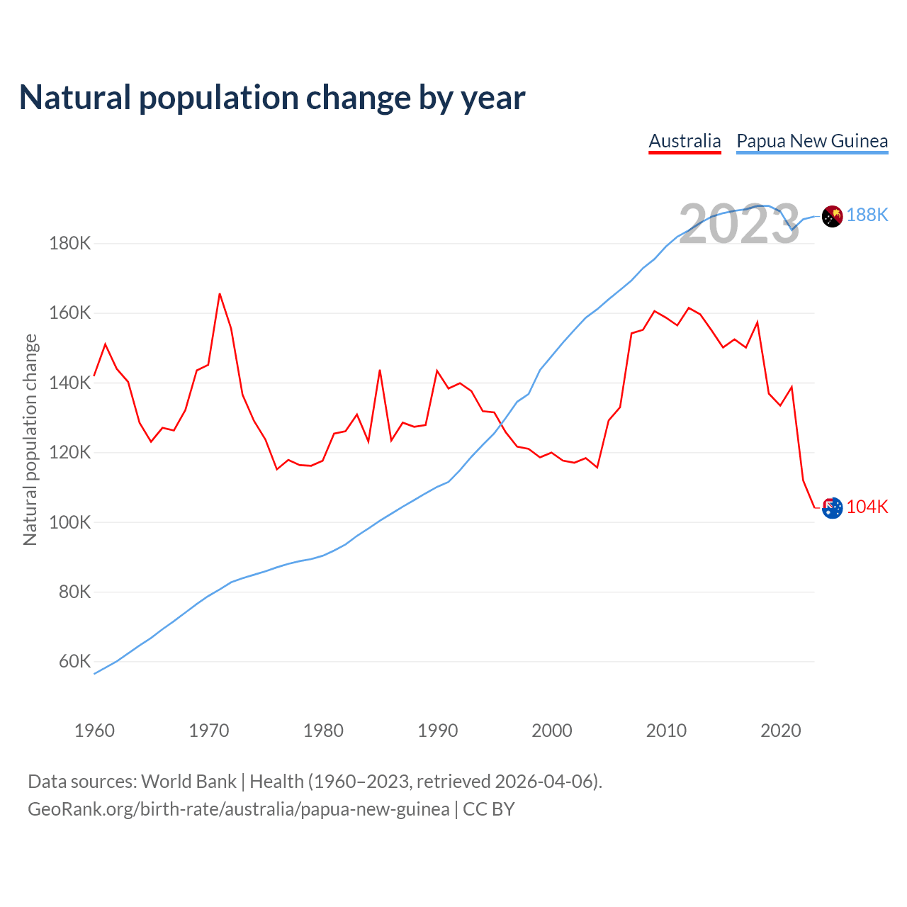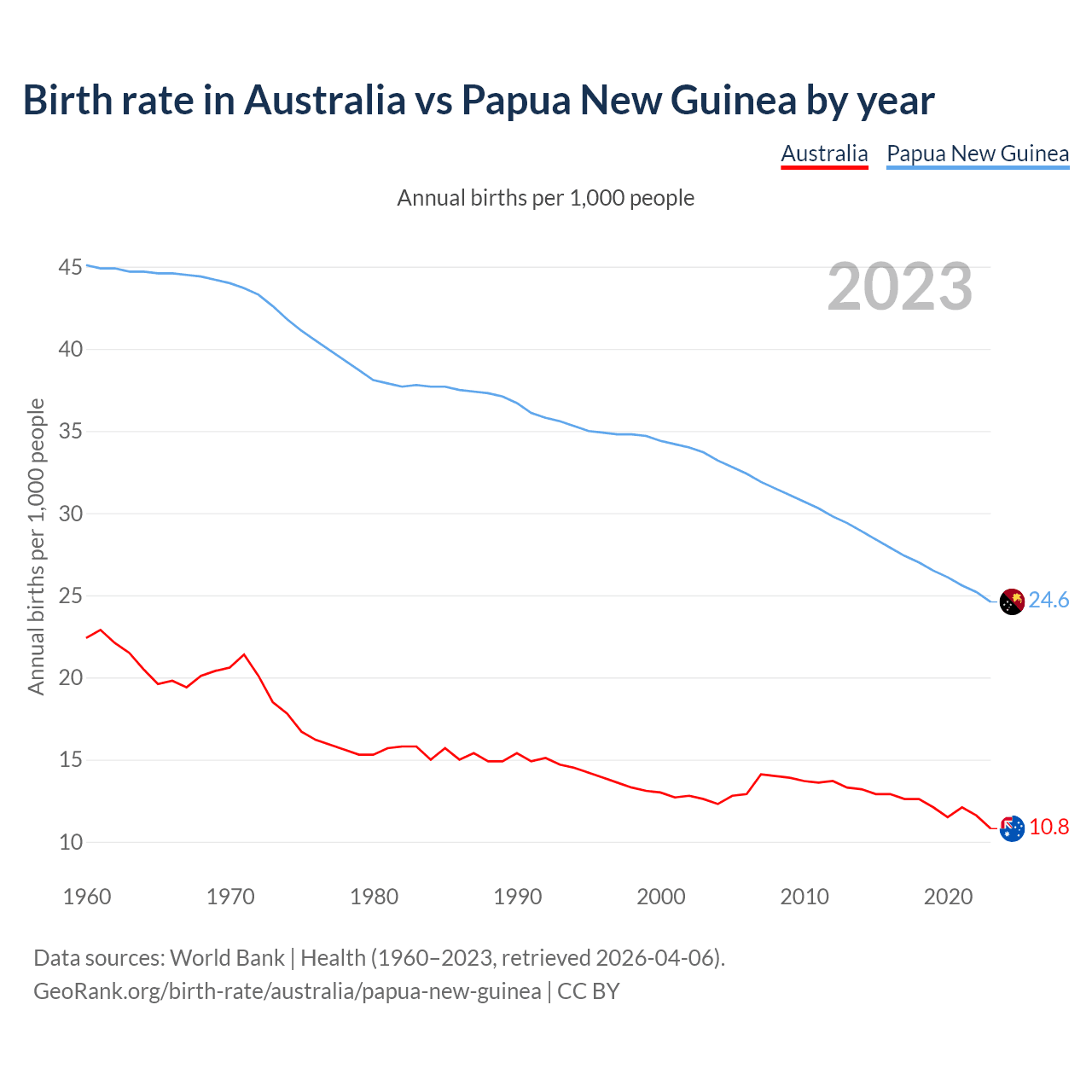 Australia has an annual birth rate of 10.8 births per 1,000 people, compared to 24.6 for Papua New Guinea. The average number of children a woman is expected to have during her lifetime — the fertility rate, is 1.5 in Australia and 3.1 in Papua New Guinea — 106.6% difference.