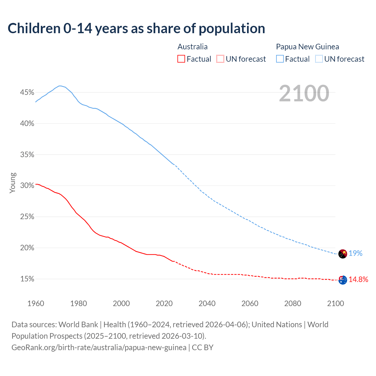According to the latest available data on birth rates, the fertility rate in Australia was 1.5 children per woman in 2023, compared to 3.1 in Papua New Guinea in 2023. The replacement level is considered to be 2.1 children per woman.