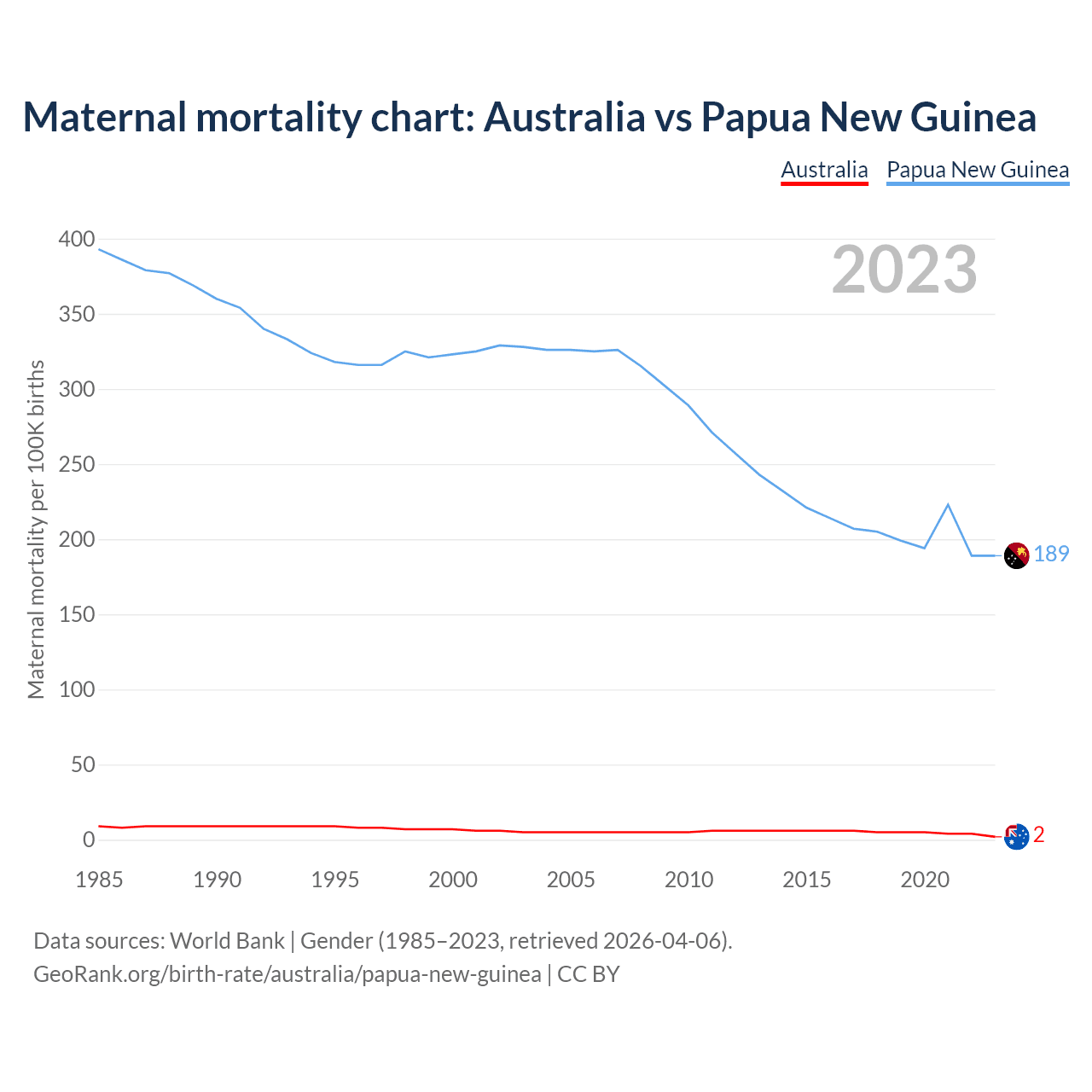 The maternal mortality rate, which is the probability of dying during childbirth or within 42 days of pregnancy termination, is 2 deaths per 100,000 live births in Australia, compared to 189 deaths in Papua New Guinea.