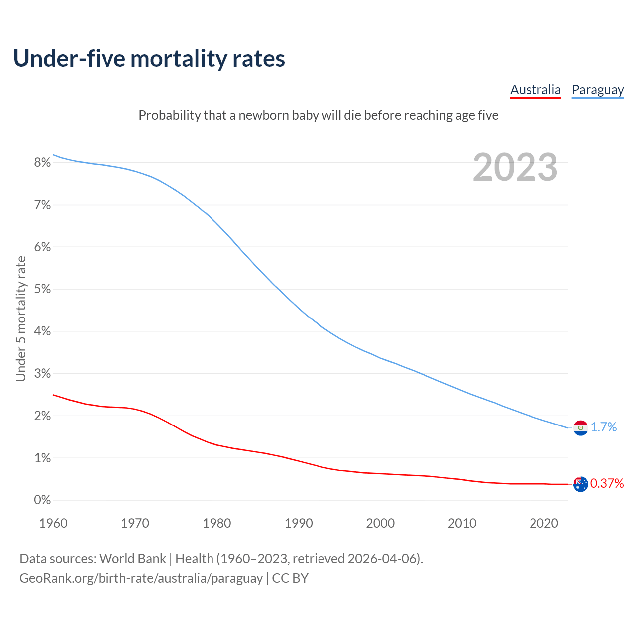 The chance that a newborn baby will die before reaching age five is 0.37% in Australia and 1.7% in Paraguay. Above is a chart with historical data on under-five mortality rates.