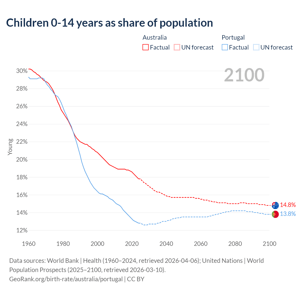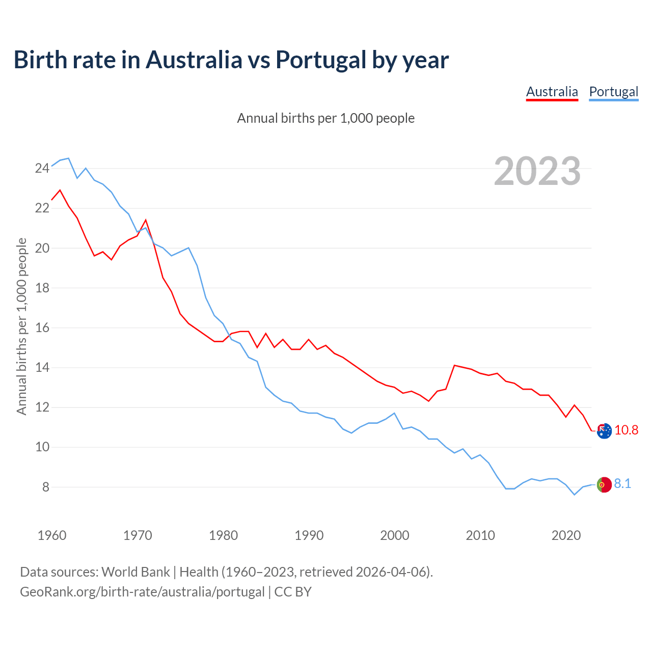 According to the latest available data on birth rates, the fertility rate in Australia was 1.5 children per woman in 2023, compared to 1.44 in Portugal in 2023. The replacement level is considered to be 2.1 children per woman.