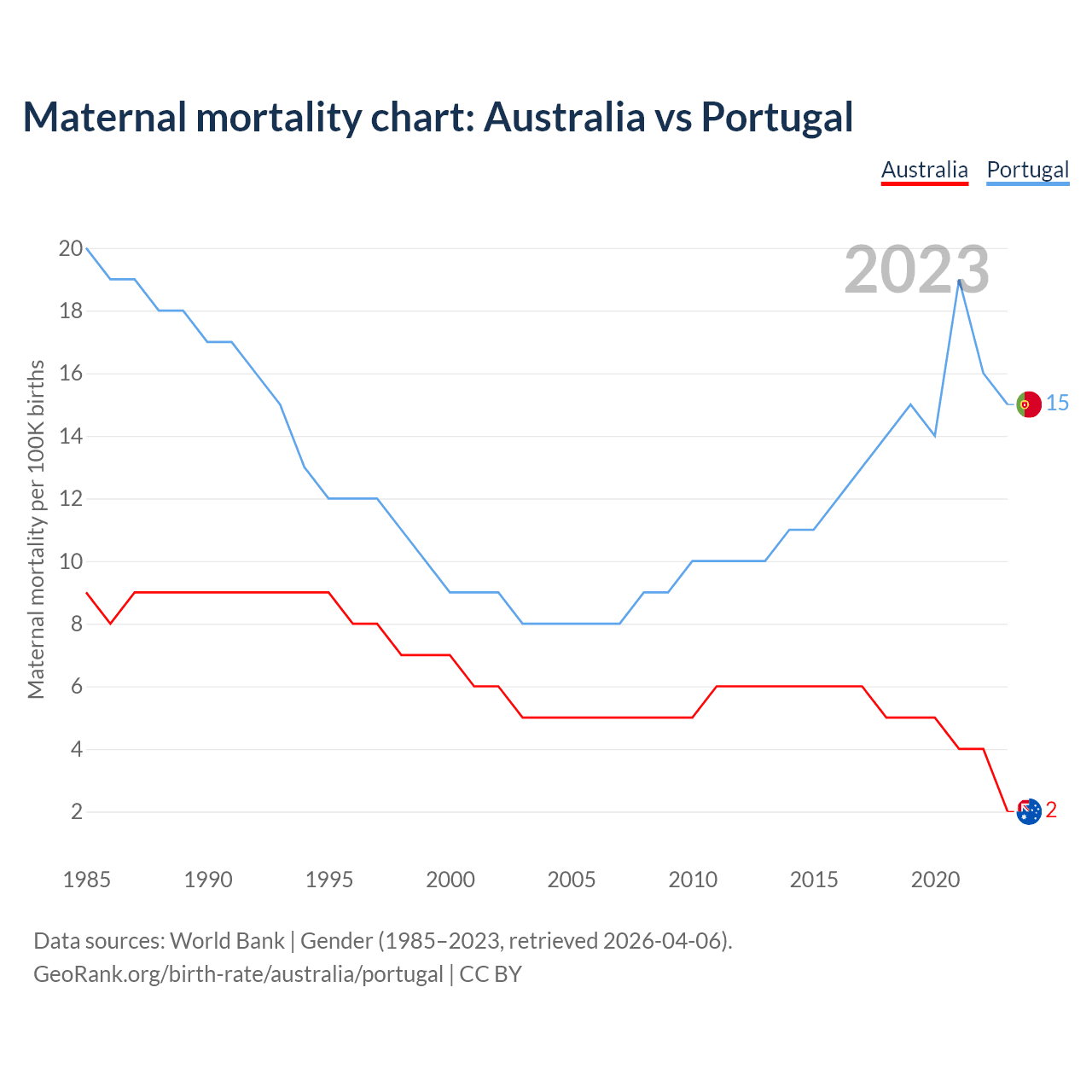 The maternal mortality rate, which is the probability of dying during childbirth or within 42 days of pregnancy termination, is 2 deaths per 100,000 live births in Australia, compared to 15 deaths in Portugal.