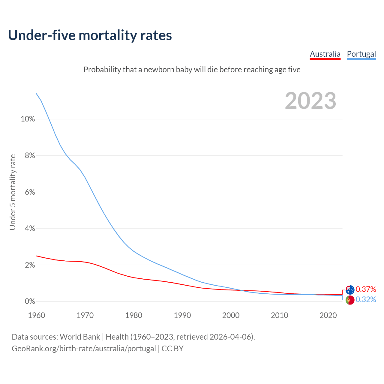 The chance that a newborn baby will die before reaching age five is 0.37% in Australia and 0.32% in Portugal. Above is a chart with historical data on under-five mortality rates.