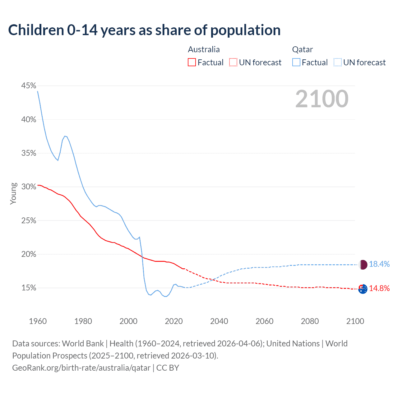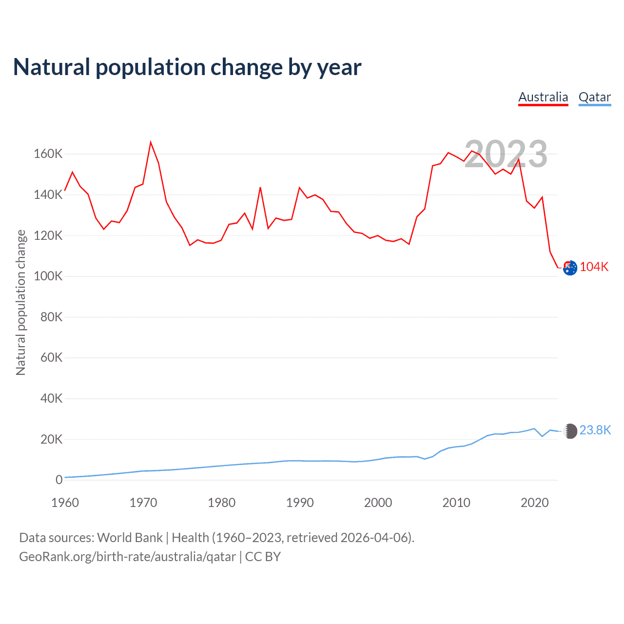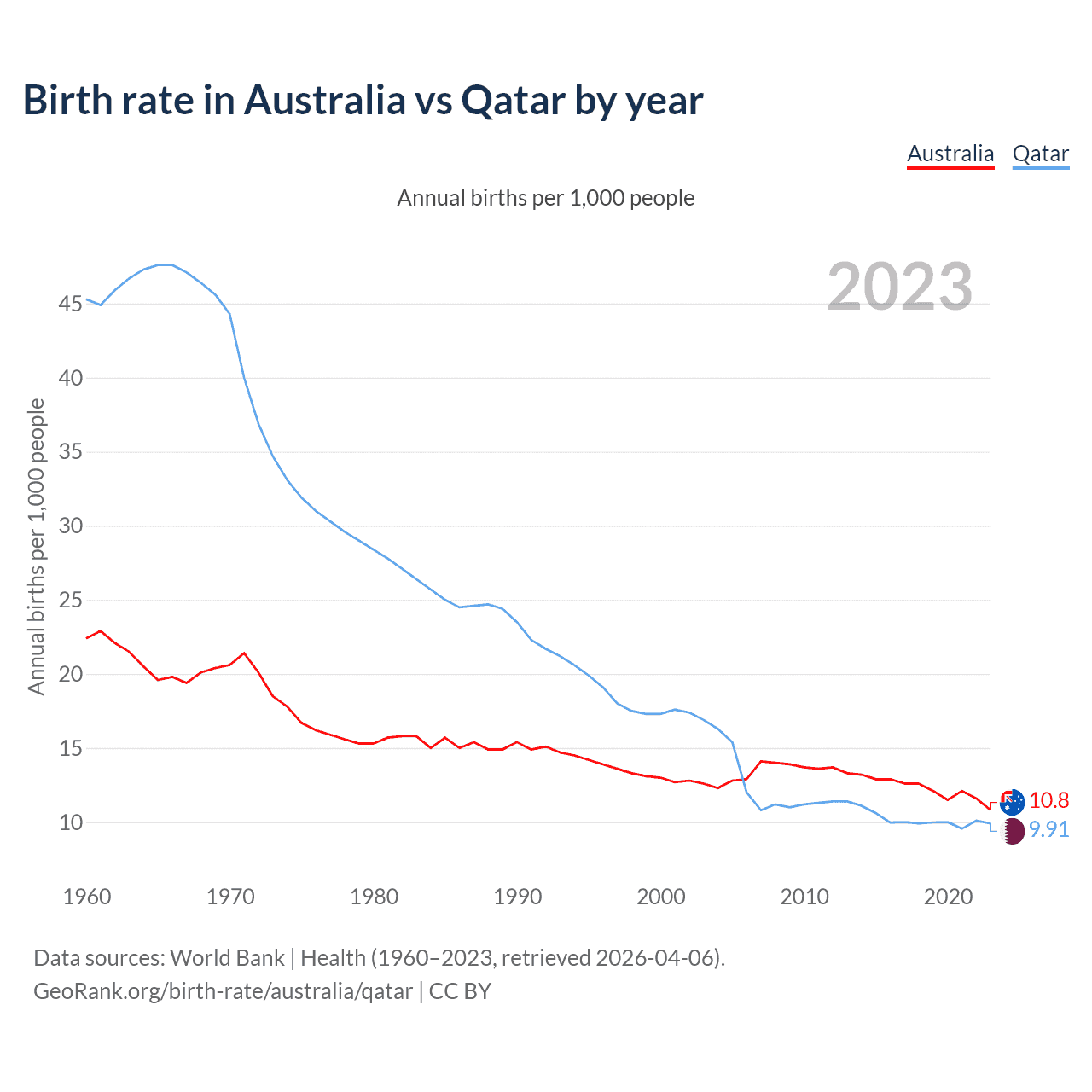 According to the latest available data on birth rates, the fertility rate in Australia was 1.5 children per woman in 2023, compared to 1.73 in Qatar in 2023. The replacement level is considered to be 2.1 children per woman.