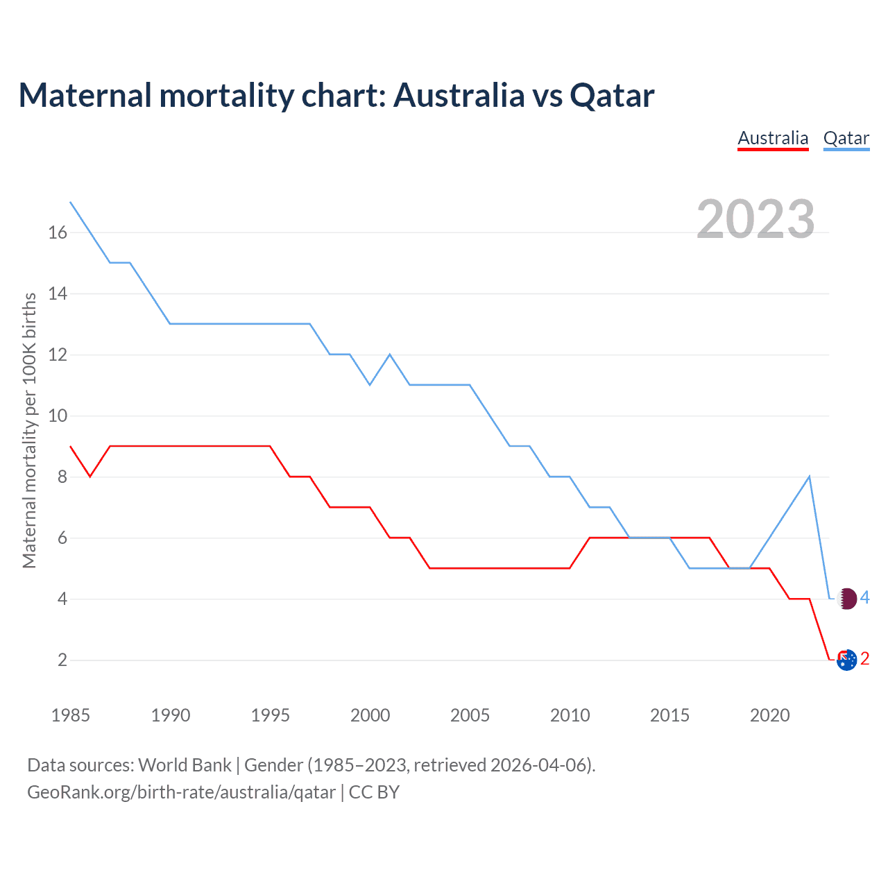 The maternal mortality rate, which is the probability of dying during childbirth or within 42 days of pregnancy termination, is 2 deaths per 100,000 live births in Australia, compared to 4 deaths in Qatar.