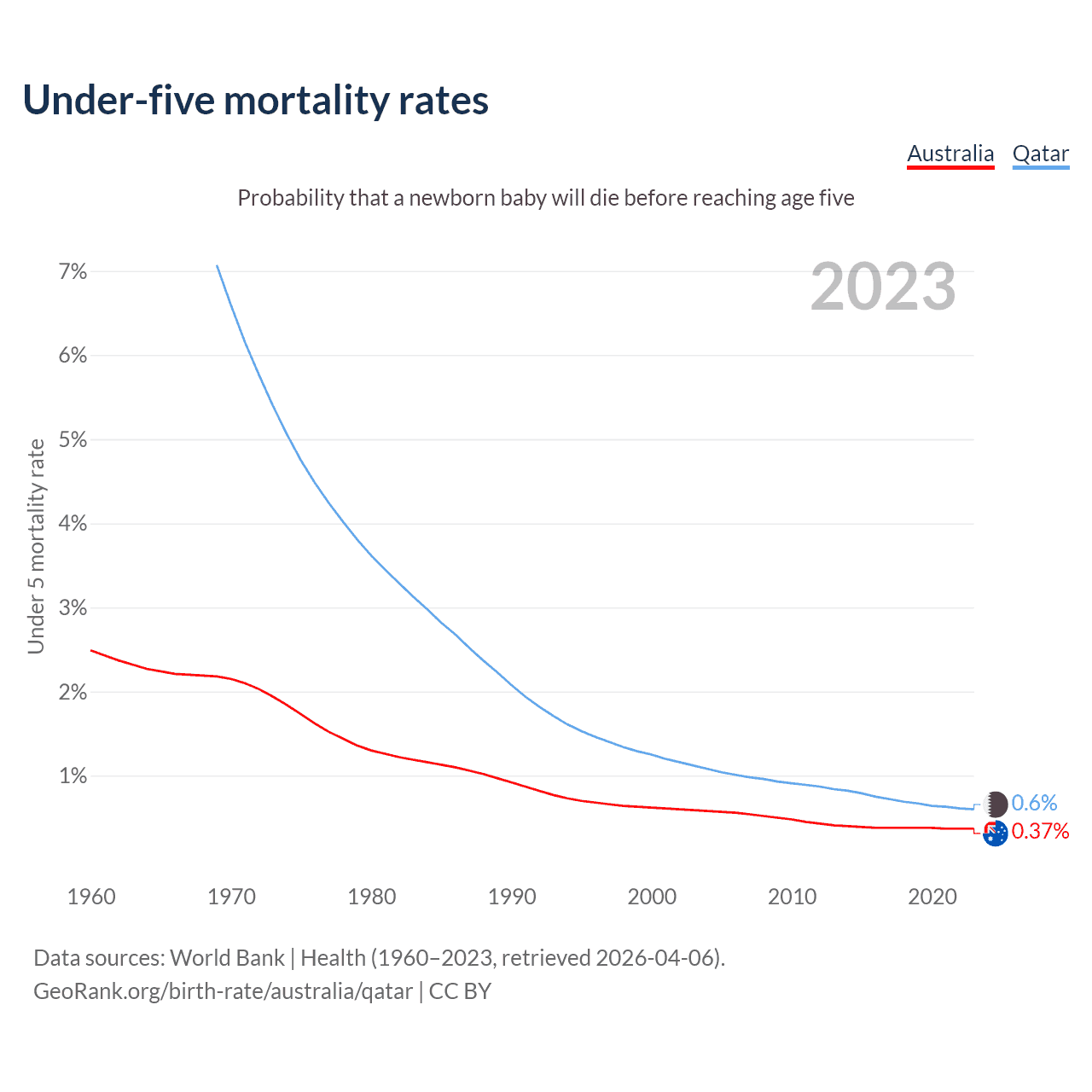 The chance that a newborn baby will die before reaching age five is 0.37% in Australia and 0.6% in Qatar. Above is a chart with historical data on under-five mortality rates.