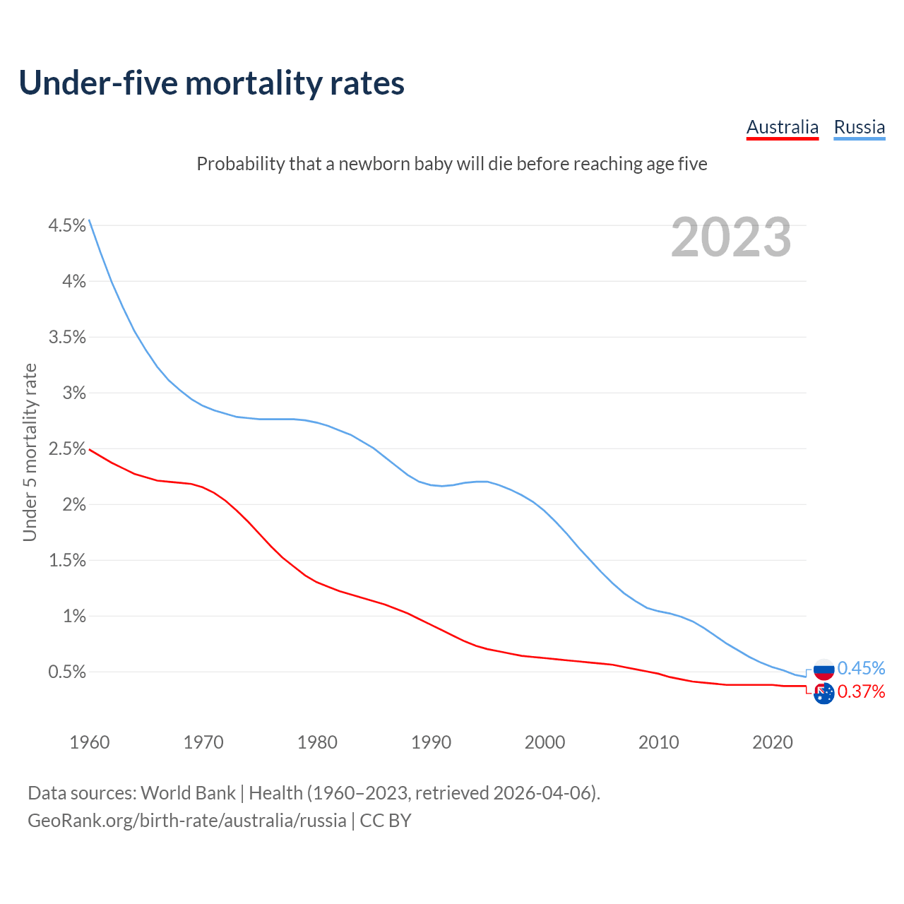 The chance that a newborn baby will die before reaching age five is 0.37% in Australia and 0.45% in Russia. Above is a chart with historical data on under-five mortality rates.