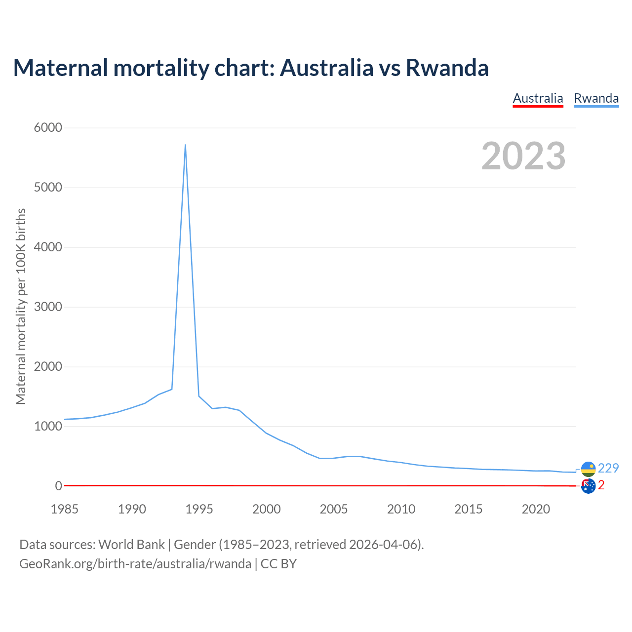 The maternal mortality rate, which is the probability of dying during childbirth or within 42 days of pregnancy termination, is 2 deaths per 100,000 live births in Australia, compared to 229 deaths in Rwanda.
