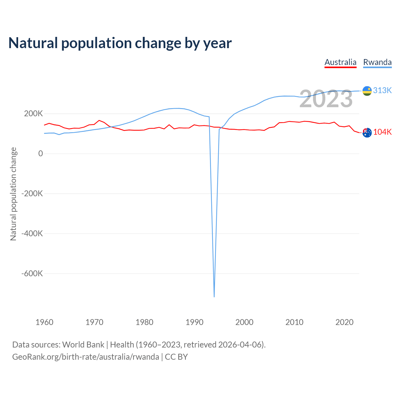 Australia has an annual birth rate of 10.8 births per 1,000 people, compared to 28.3 for Rwanda. The average number of children a woman is expected to have during her lifetime — the fertility rate, is 1.5 in Australia and 3.7 in Rwanda — 146.5% difference.