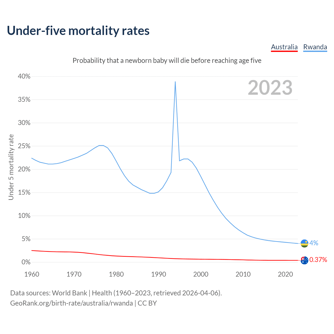 The chance that a newborn baby will die before reaching age five is 0.37% in Australia and 4% in Rwanda. Above is a chart with historical data on under-five mortality rates.