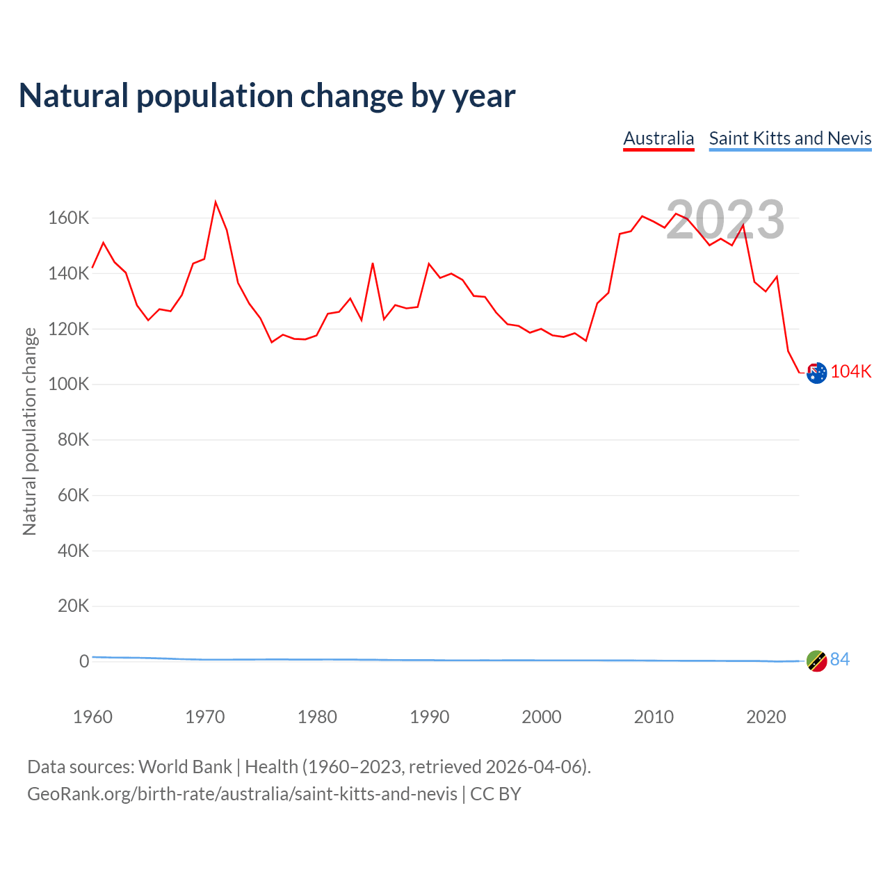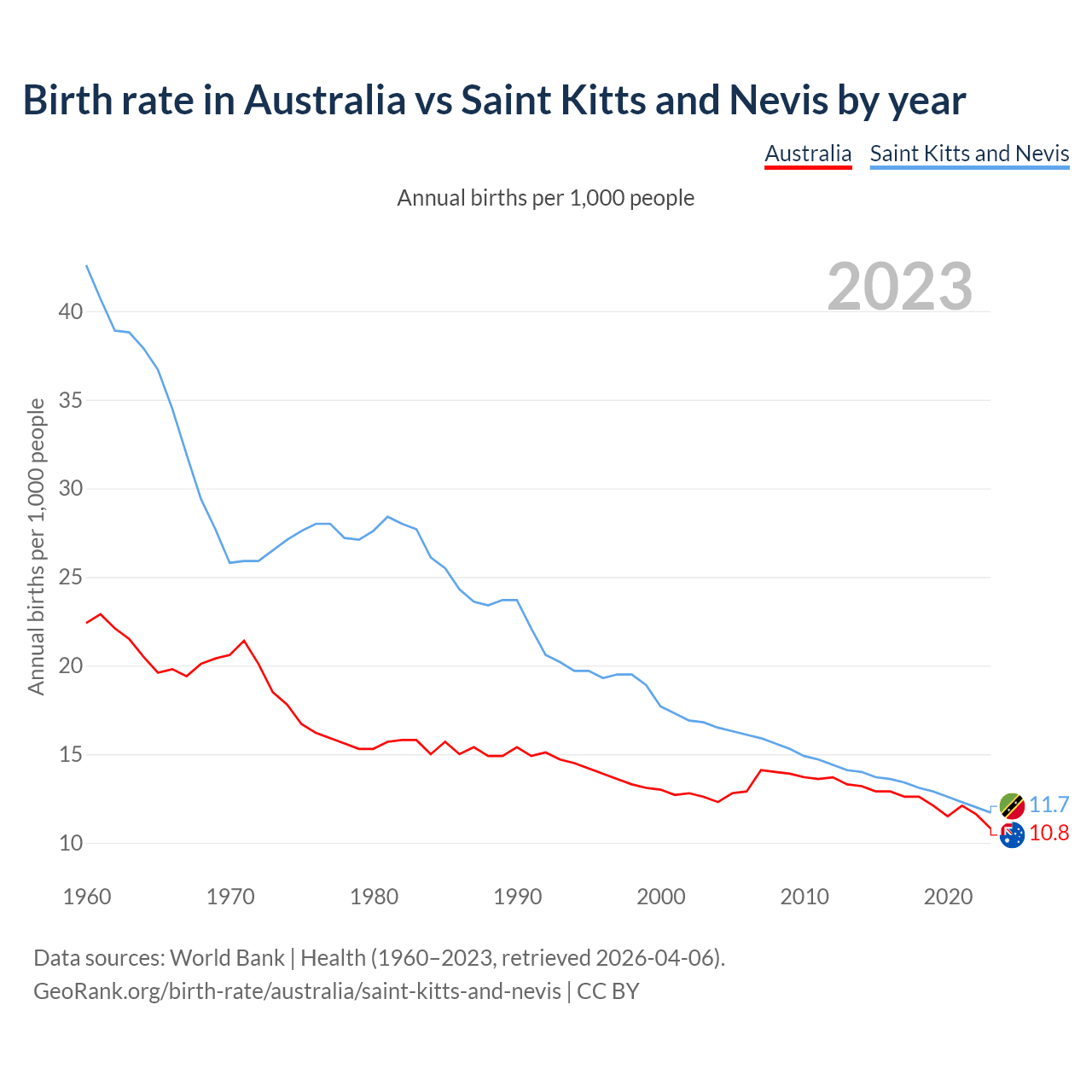 Australia has an annual birth rate of 10.8 births per 1,000 people, compared to 11.7 for Saint Kitts and Nevis. The average number of children a woman is expected to have during her lifetime — the fertility rate, is 1.5 in Australia and 1.51 in Saint Kitts and Nevis — 0.33% difference.