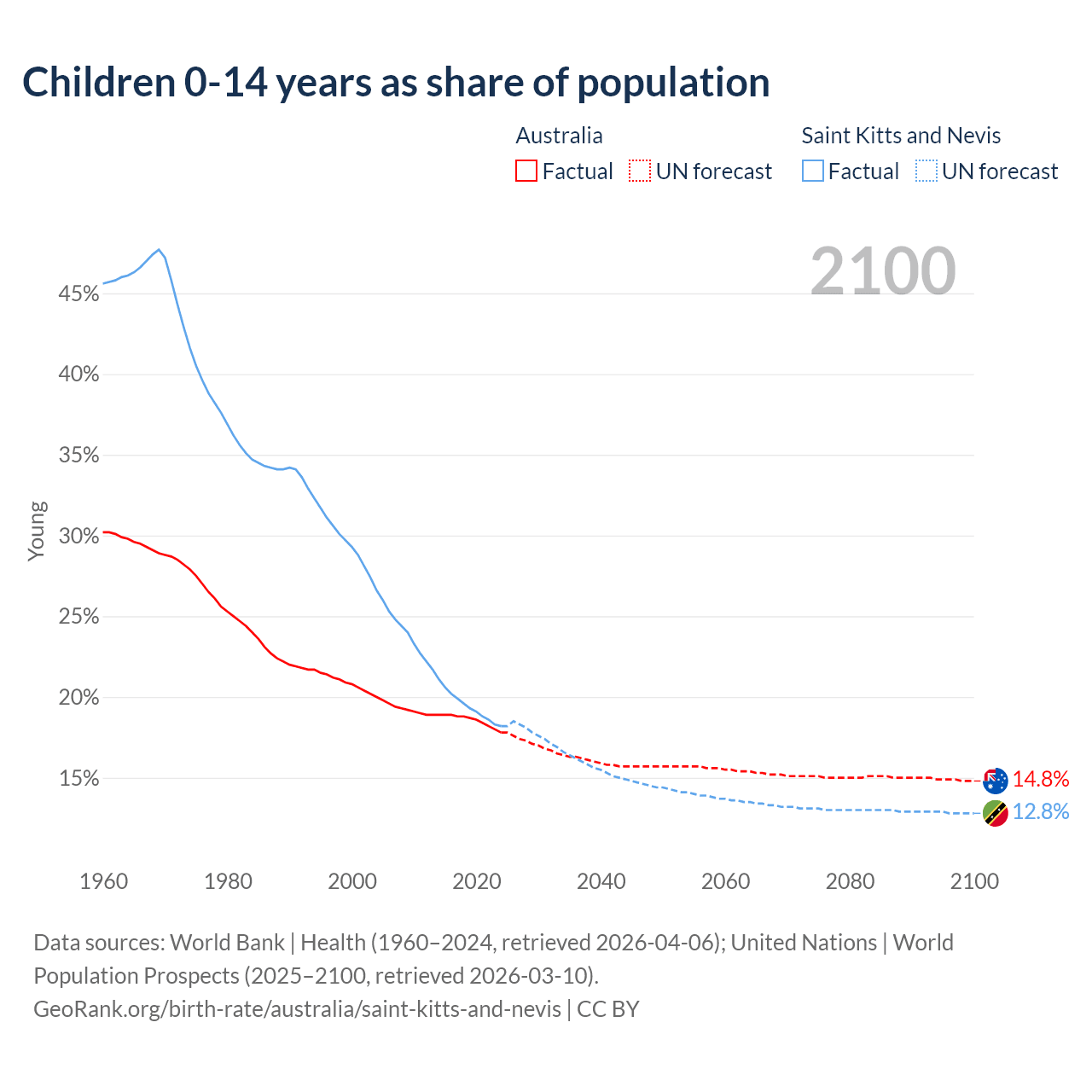 According to the latest available data on birth rates, the fertility rate in Australia was 1.5 children per woman in 2023, compared to 1.51 in Saint Kitts and Nevis in 2023. The replacement level is considered to be 2.1 children per woman.