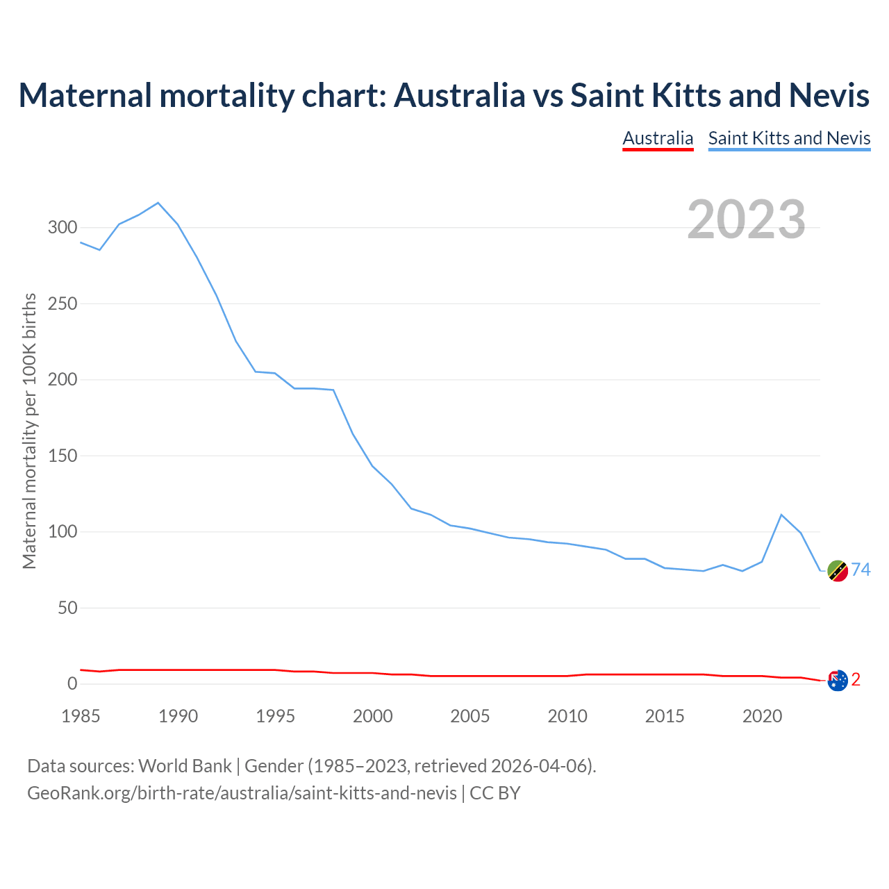 The maternal mortality rate, which is the probability of dying during childbirth or within 42 days of pregnancy termination, is 2 deaths per 100,000 live births in Australia, compared to 74 deaths in Saint Kitts and Nevis.