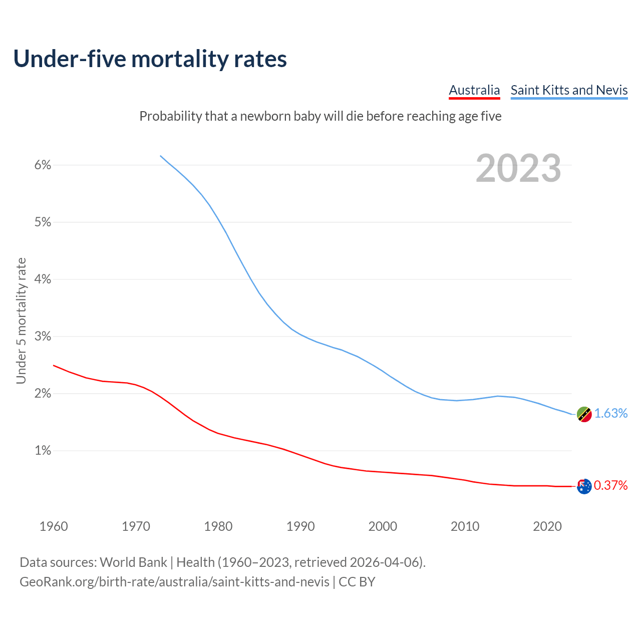 The chance that a newborn baby will die before reaching age five is 0.37% in Australia and 1.63% in Saint Kitts and Nevis. Above is a chart with historical data on under-five mortality rates.