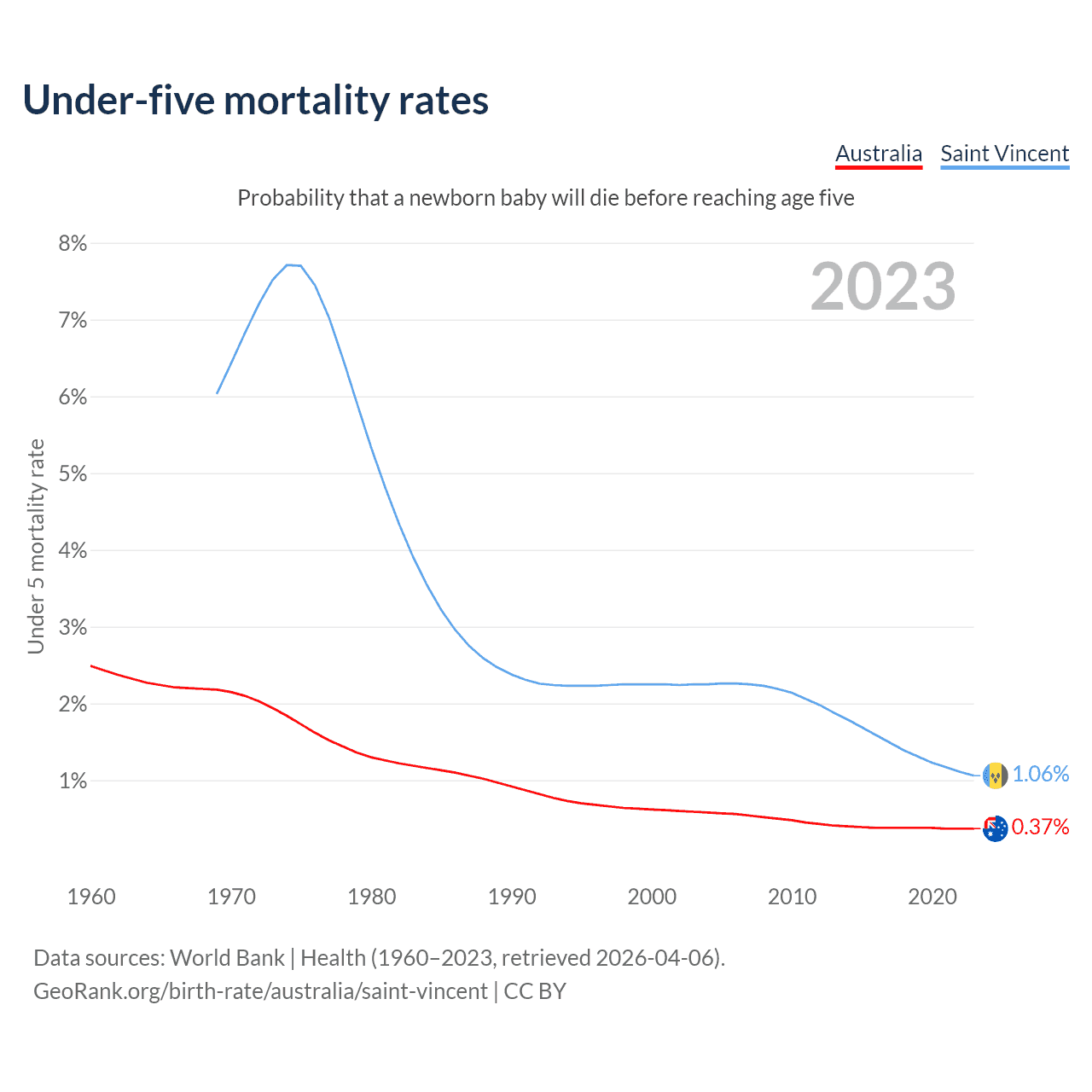 The chance that a newborn baby will die before reaching age five is 0.37% in Australia and 1.06% in Saint Vincent. Above is a chart with historical data on under-five mortality rates.