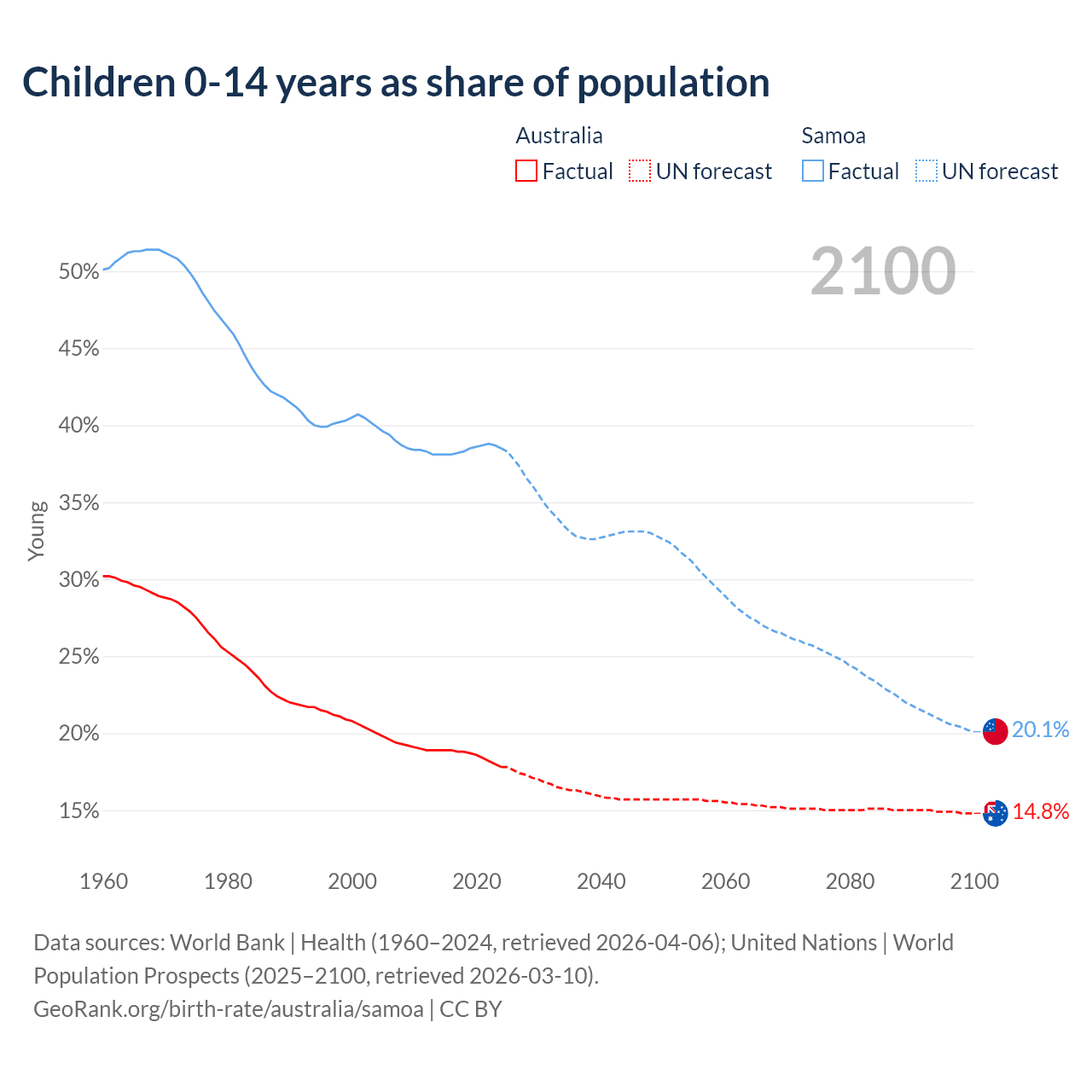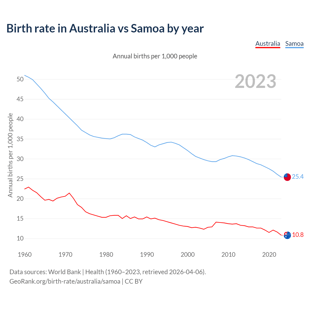 Australia has an annual birth rate of 10.8 births per 1,000 people, compared to 25.4 for Samoa. The average number of children a woman is expected to have during her lifetime — the fertility rate, is 1.5 in Australia and 3.83 in Samoa — 155.3% difference.