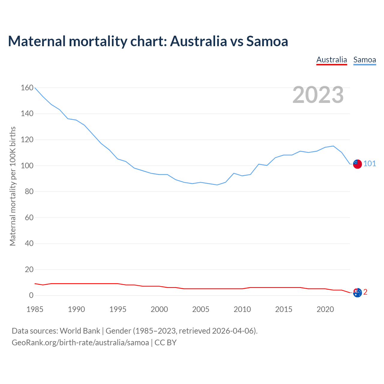The maternal mortality rate, which is the probability of dying during childbirth or within 42 days of pregnancy termination, is 2 deaths per 100,000 live births in Australia, compared to 101 deaths in Samoa.
