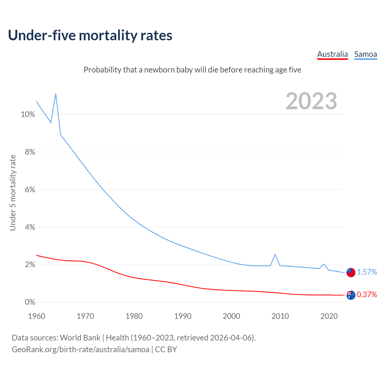 The chance that a newborn baby will die before reaching age five is 0.37% in Australia and 1.57% in Samoa. Above is a chart with historical data on under-five mortality rates.