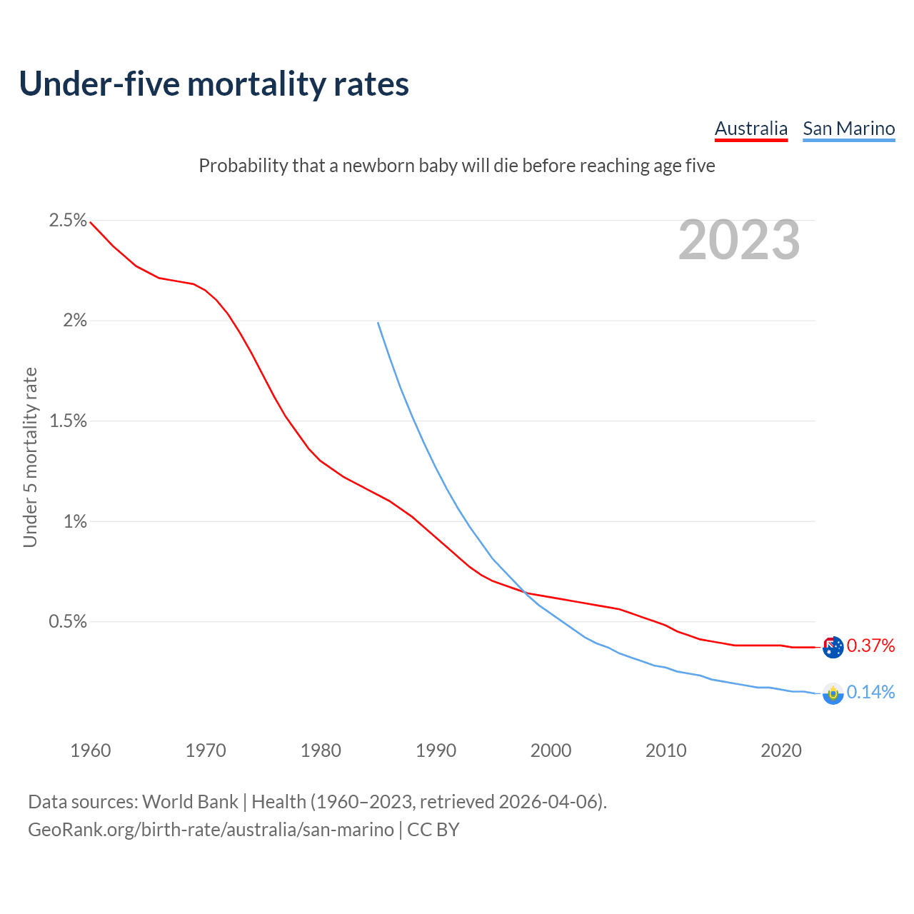 The chance that a newborn baby will die before reaching age five is 0.37% in Australia and 0.14% in San Marino. Above is a chart with historical data on under-five mortality rates.