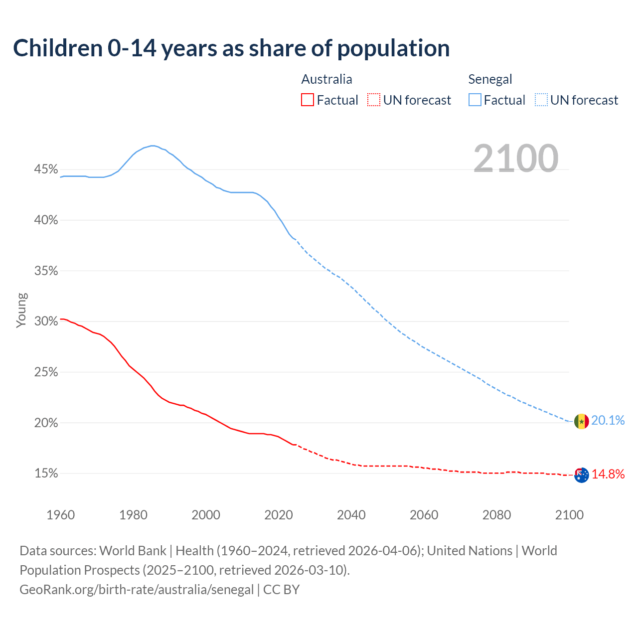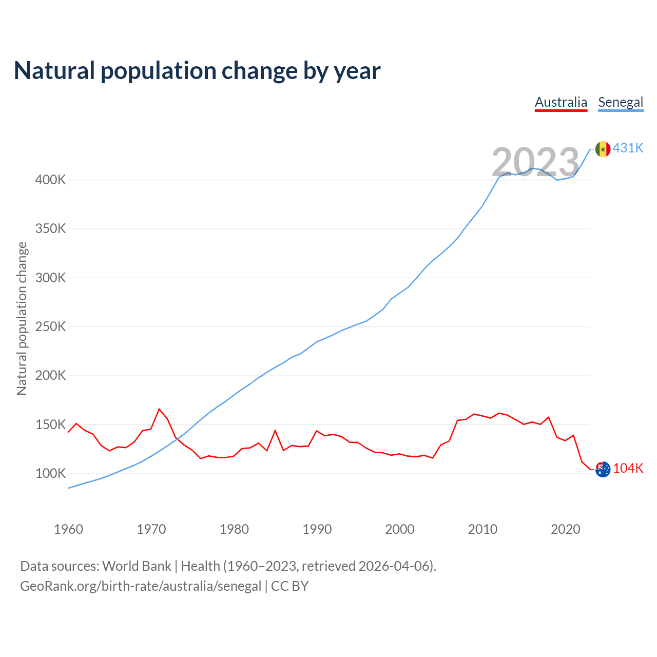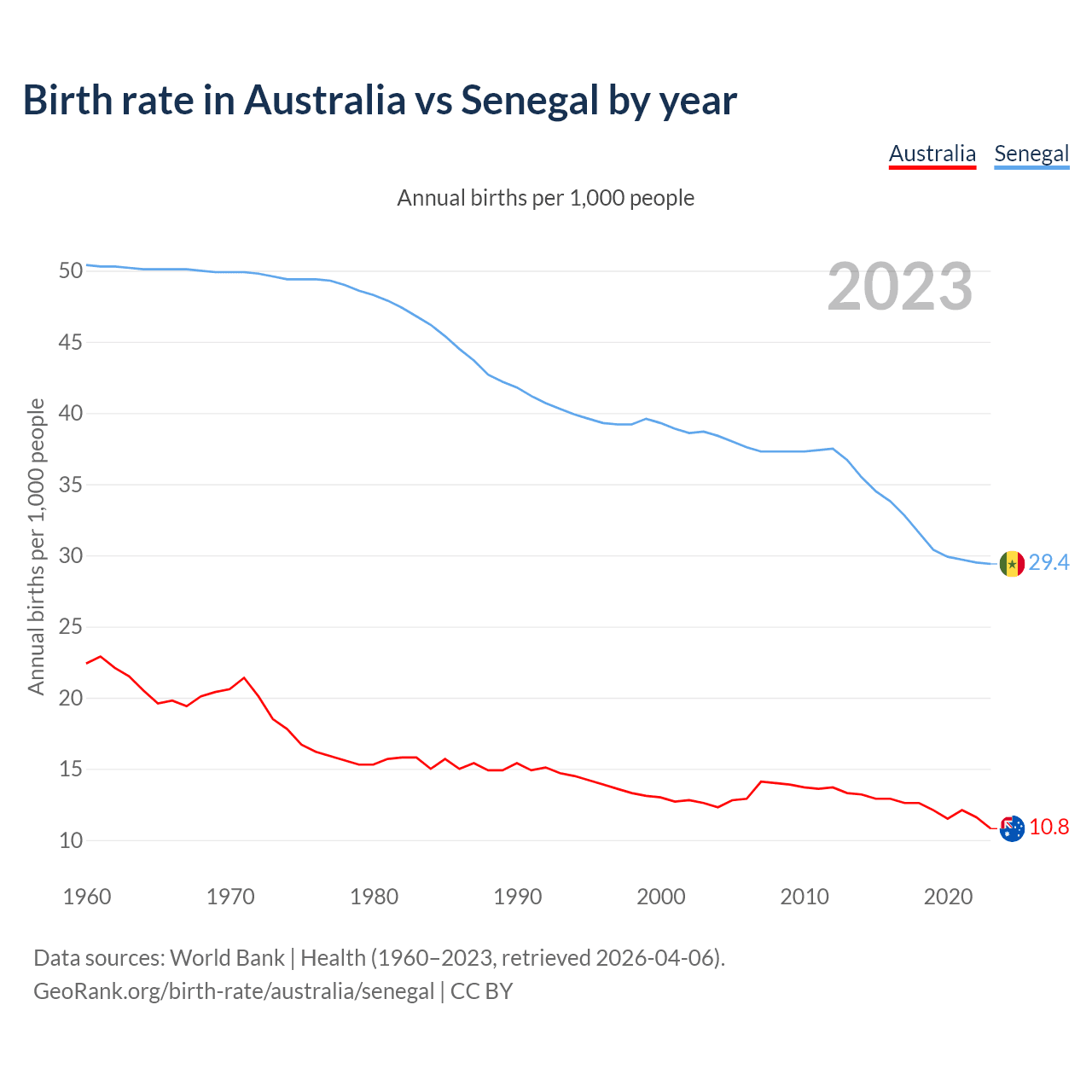 Australia has an annual birth rate of 10.8 births per 1,000 people, compared to 29.4 for Senegal. The average number of children a woman is expected to have during her lifetime — the fertility rate, is 1.5 in Australia and 3.82 in Senegal — 154.5% difference.
