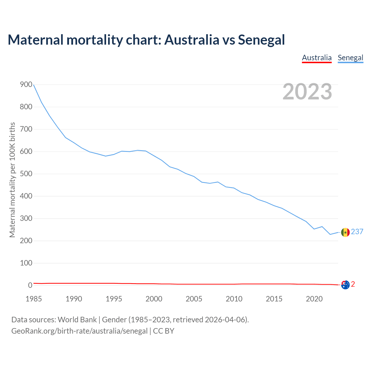 The maternal mortality rate, which is the probability of dying during childbirth or within 42 days of pregnancy termination, is 2 deaths per 100,000 live births in Australia, compared to 237 deaths in Senegal.