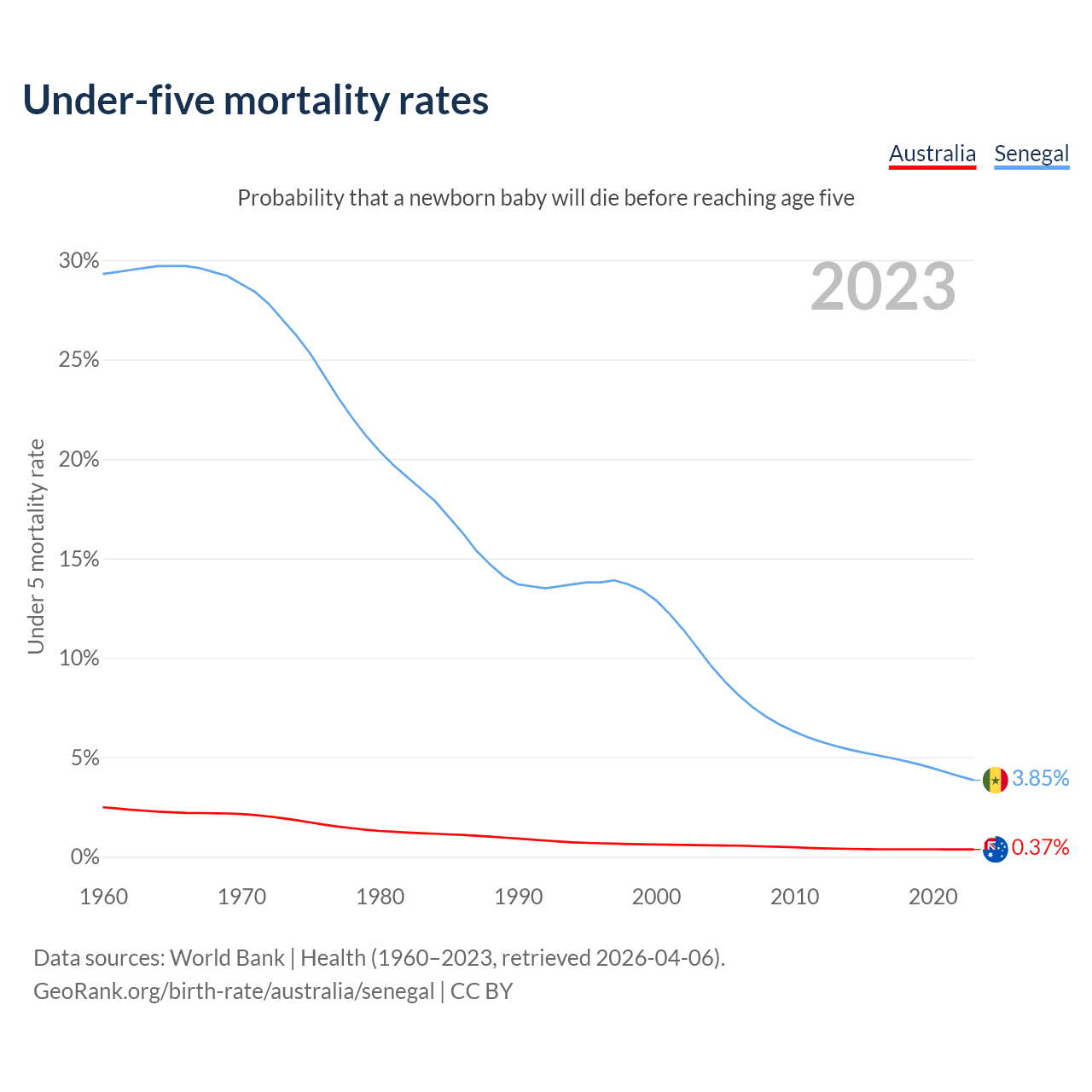The chance that a newborn baby will die before reaching age five is 0.37% in Australia and 3.85% in Senegal. Above is a chart with historical data on under-five mortality rates.