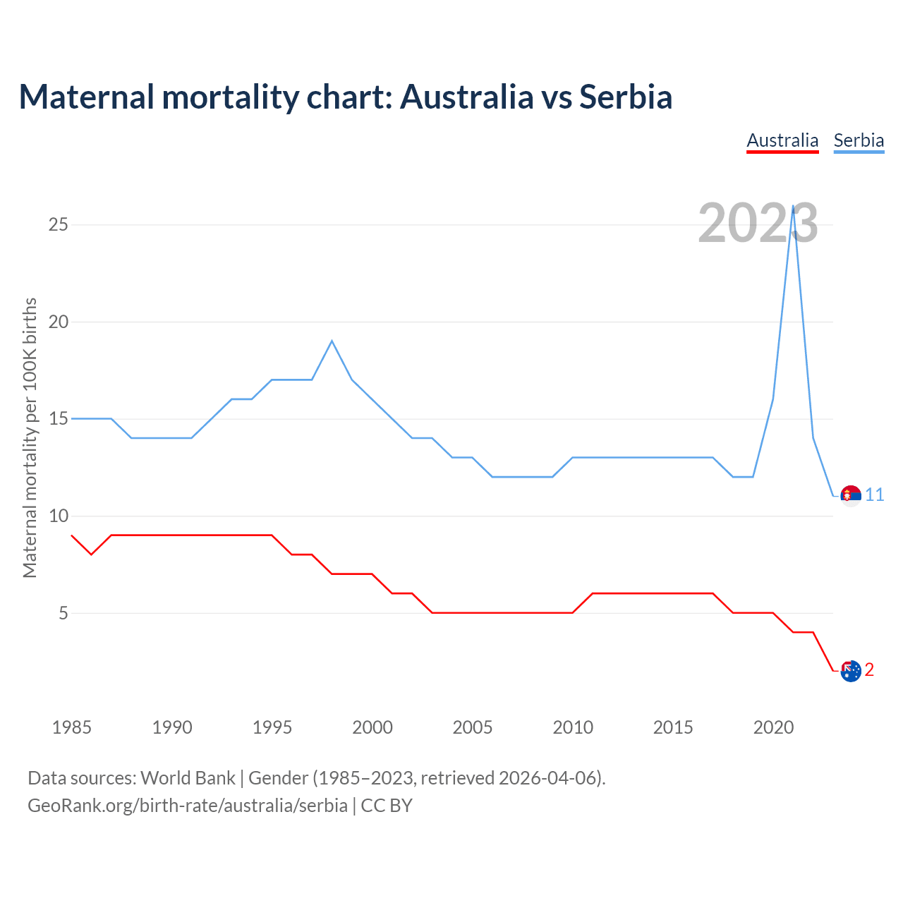 The maternal mortality rate, which is the probability of dying during childbirth or within 42 days of pregnancy termination, is 2 deaths per 100,000 live births in Australia, compared to 11 deaths in Serbia.