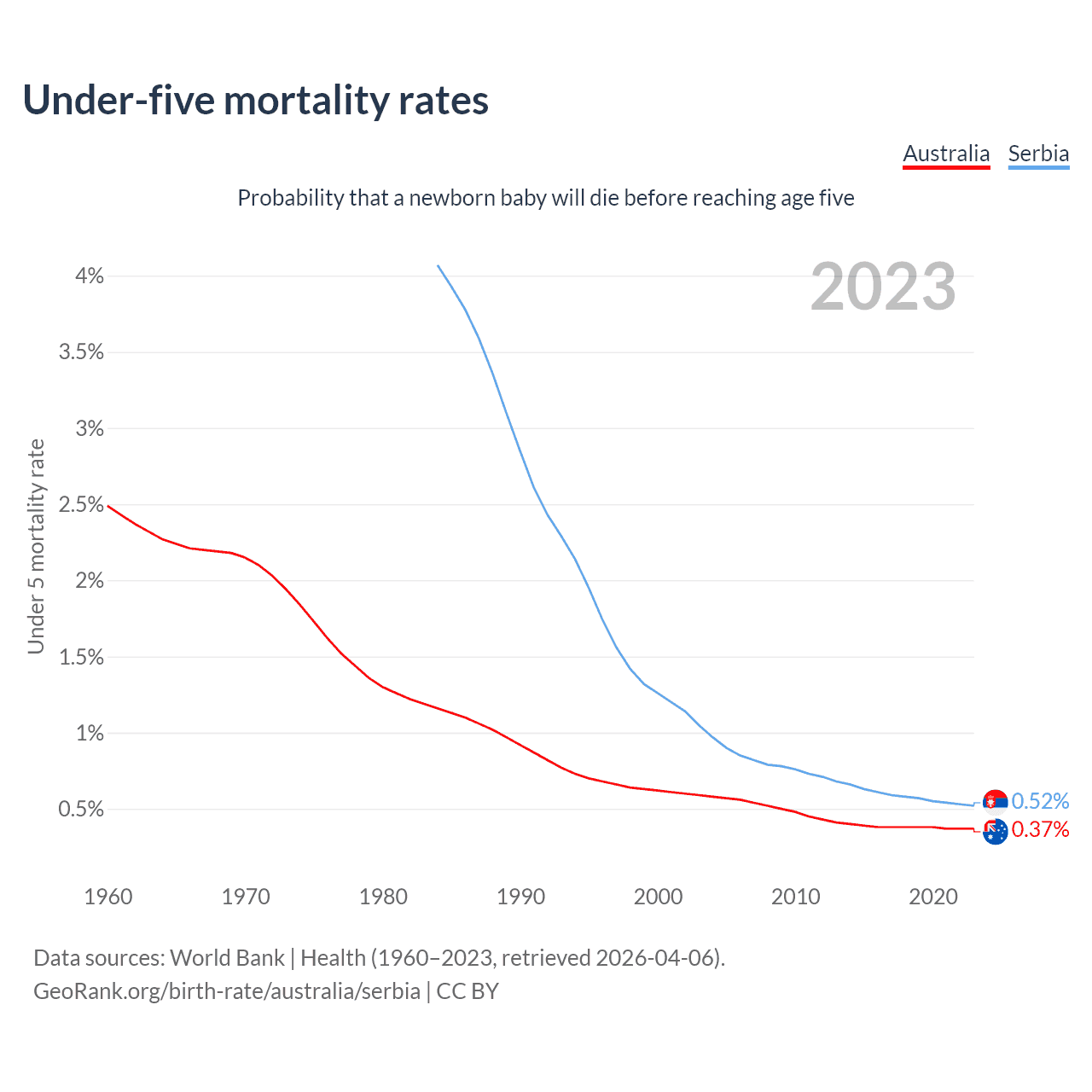 The chance that a newborn baby will die before reaching age five is 0.37% in Australia and 0.52% in Serbia. Above is a chart with historical data on under-five mortality rates.