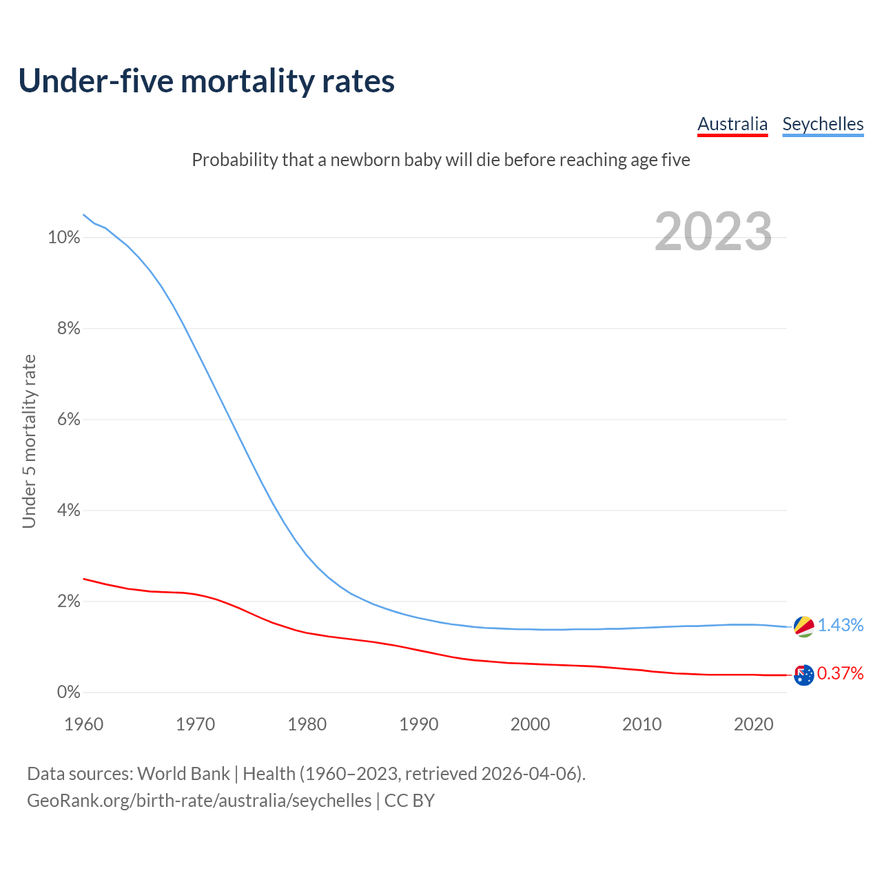 The chance that a newborn baby will die before reaching age five is 0.37% in Australia and 1.43% in the Seychelles. Above is a chart with historical data on under-five mortality rates.